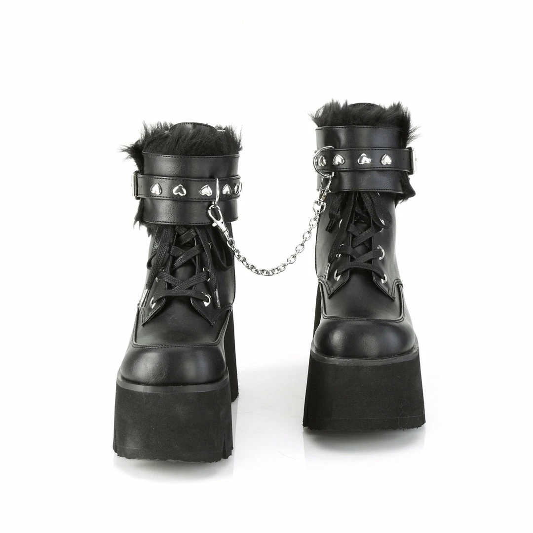 A Shoe Addiction DEMONIA Ashes-57 Black Heart Stud Fur Removeable Strap Chain 3.25″ Platform Boot Boots
