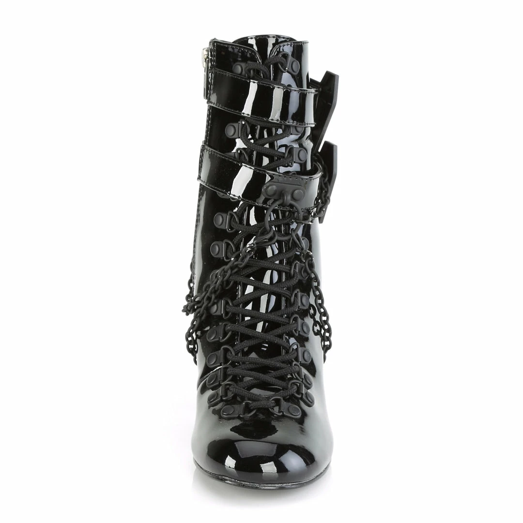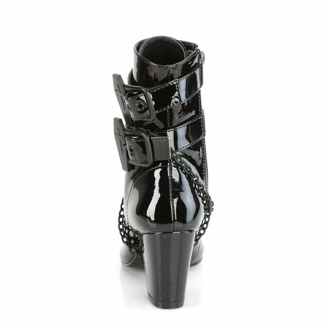 3″ (76mm) Block Heel Round Toe D-Ring Lace-Up Ankle Boot Featuring Double Coffin Buckle Straps w/ O-Ring Plate and Double Hanging Chain Drapped Through the Heel Channel & Wrapping the Heel