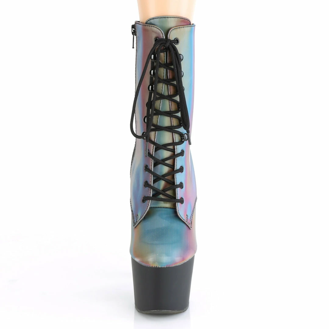7″ (178mm) Heel, 2 3/4″ (70mm) Platform Lace-Up Front Ankle Boot w/Reflective Effect Upper, Inside Zip Closure