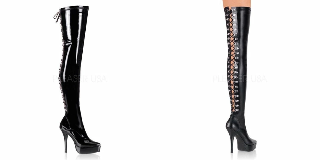 5 1/4″ (13.3cm) Heel, 1 1/4″ (3.2cm) Platform Back Lace Up Stretch Thigh Boot, Full Inner Side Zipper
