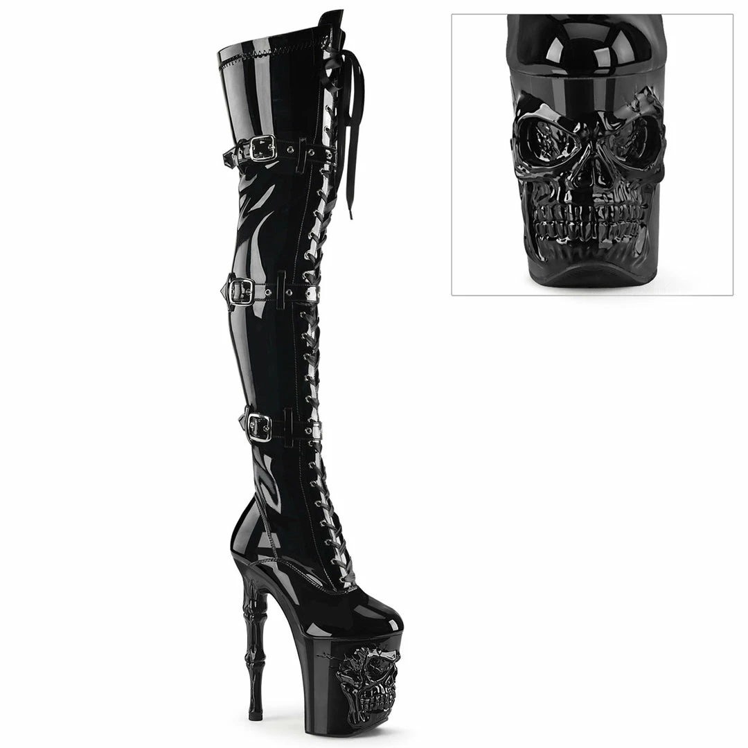 8″ (200mm) Finger Bone Heel, 4″ (100mm) Skull Sculpted Platform Ribbon Lace-Up Front Triple Buckle Strap Stretch Thigh High Boot, Full-Length Inner Side Zip Closure