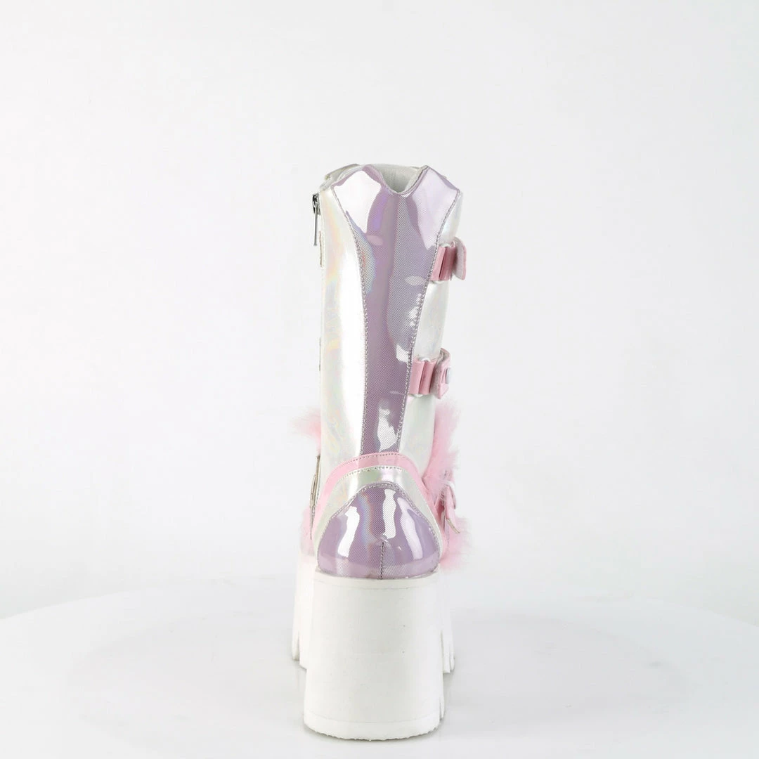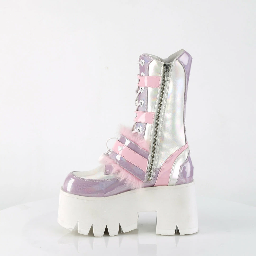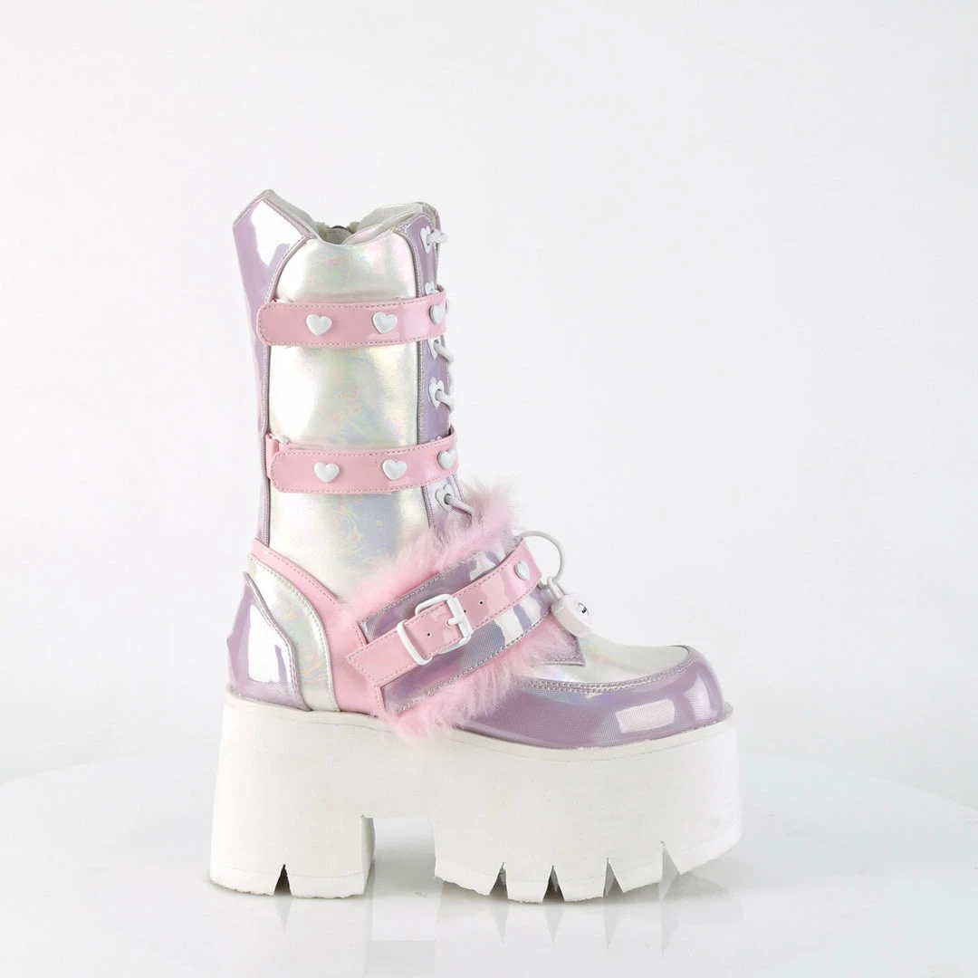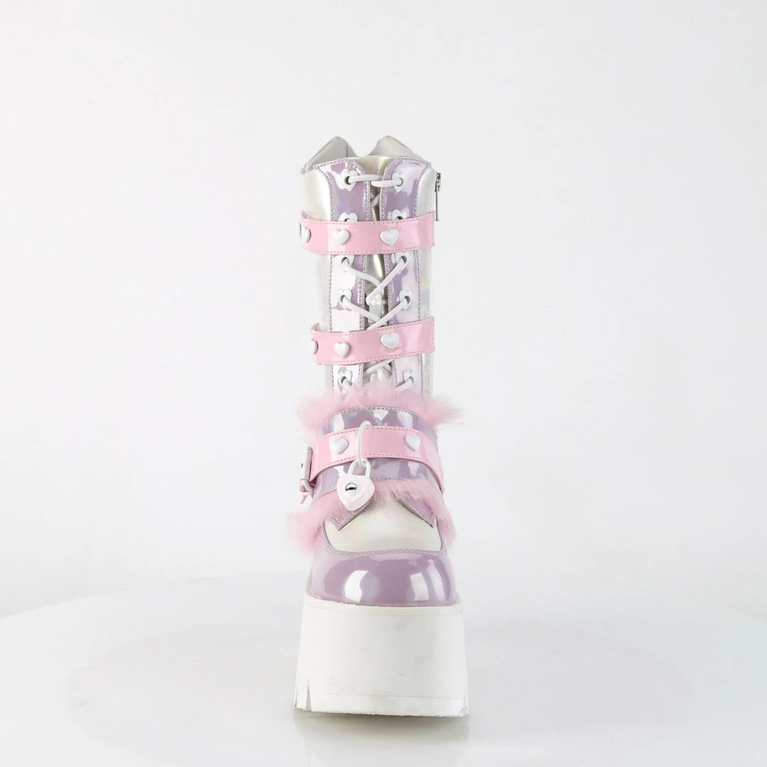 3 1/2″ (90mm) Chunky Heel, 2 1/4″ (57mm) Cut-Out Platform Heart Eyelet Lace-Up Mid-Calf Boot Featuring Triple Hook & Loop Straps w/ Heart Stud Detals & Fur Lined Adjustable Bottom Strap W/ Heart Locket & D-Ring Details, Metal Side Zip Closure