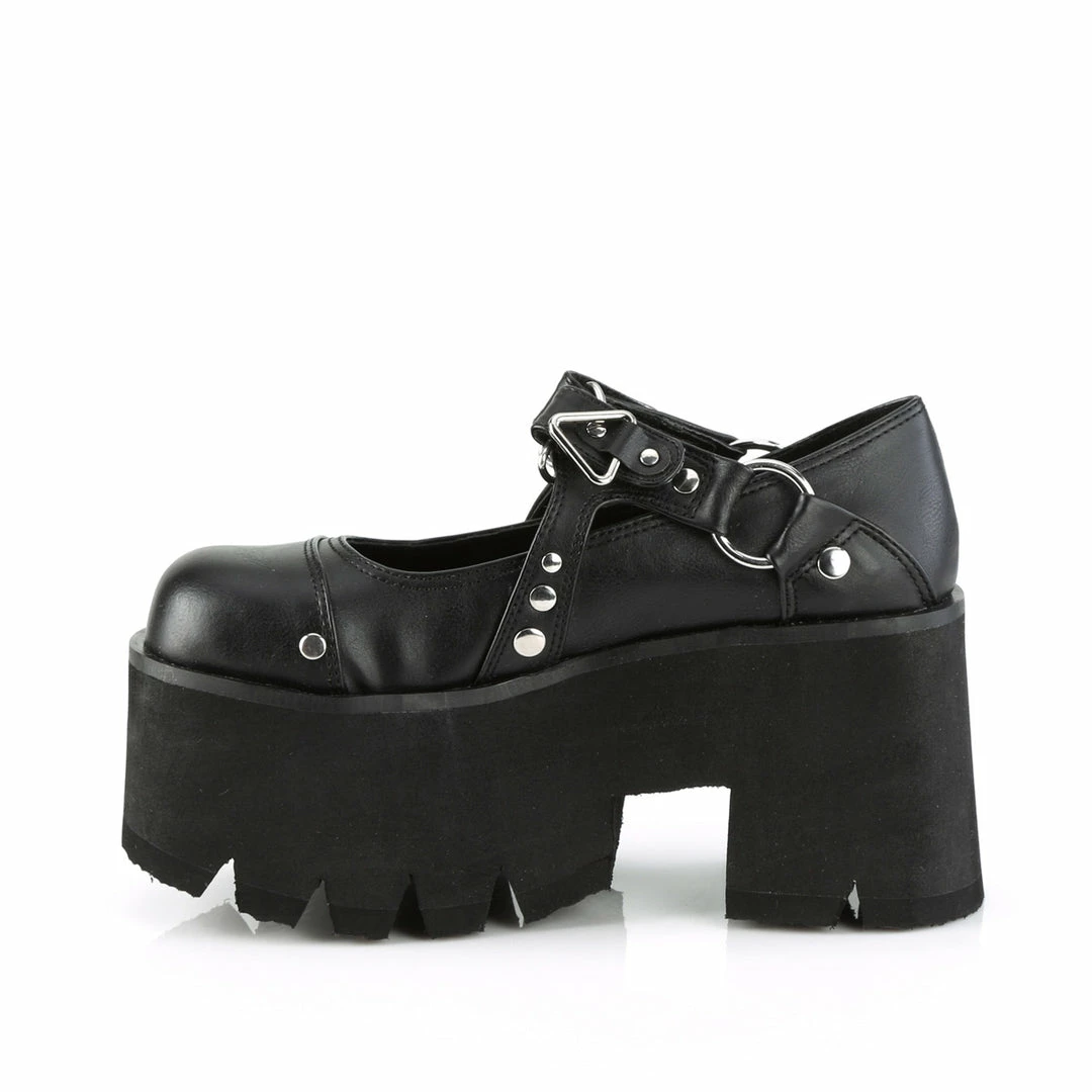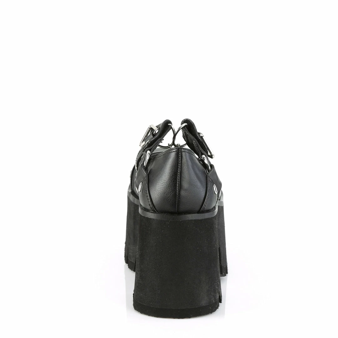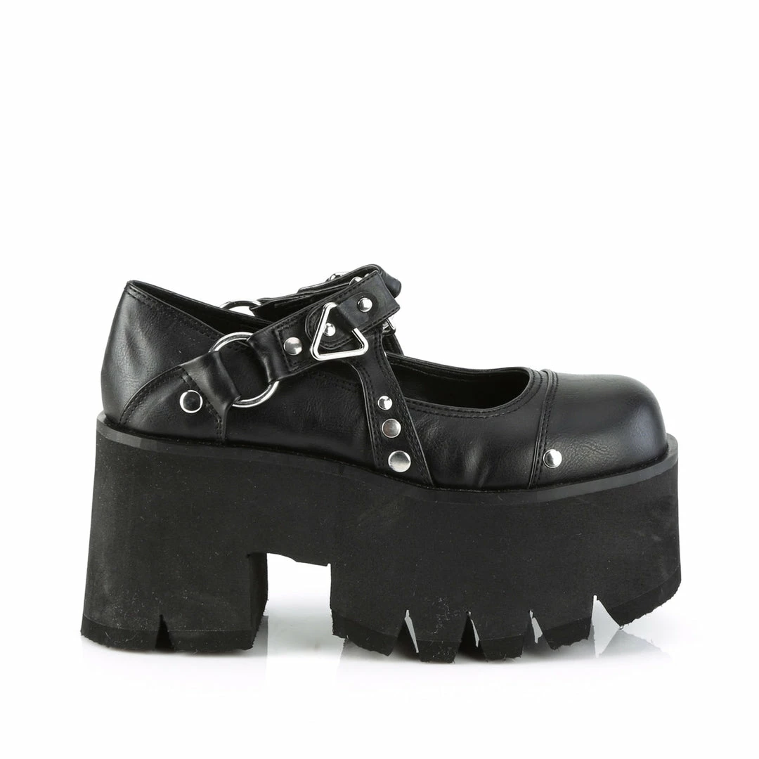 3 1/2″ (90mm) Chunky Heel, 2 1/4” (57mm) Cut Out Platform Hook & Loop Maryjane Featuring Silver Stud Embellishments on Upper, Triangle & O-Ring Details & Coffin Shaped Charm at Center Strap