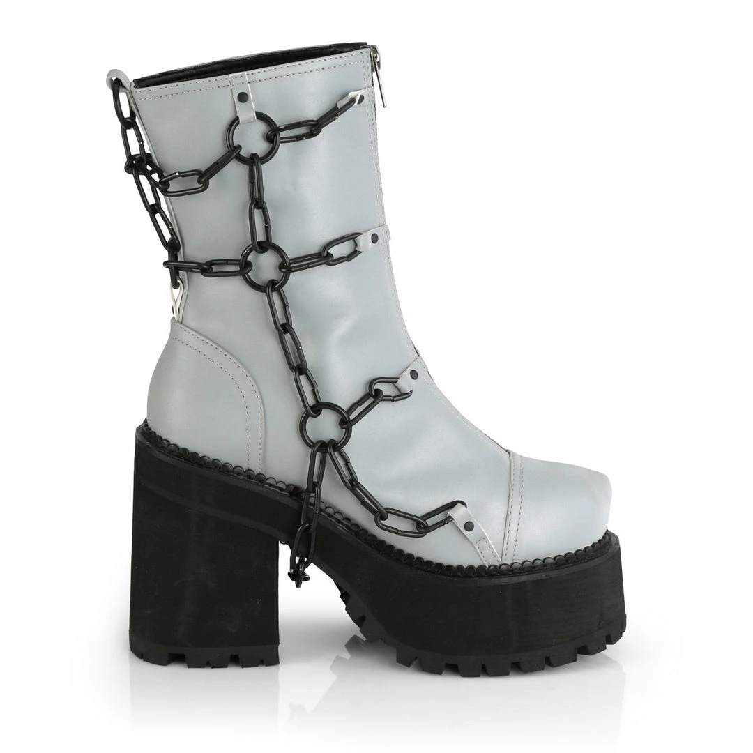 4 3/4″ (121mm) Block Heel, 2 1/4″ (57mm) Cleated Platform Ankle Boot Featuring Metal Cage Chain Detailing on the Vamp, Full Front Metal Zip Closure