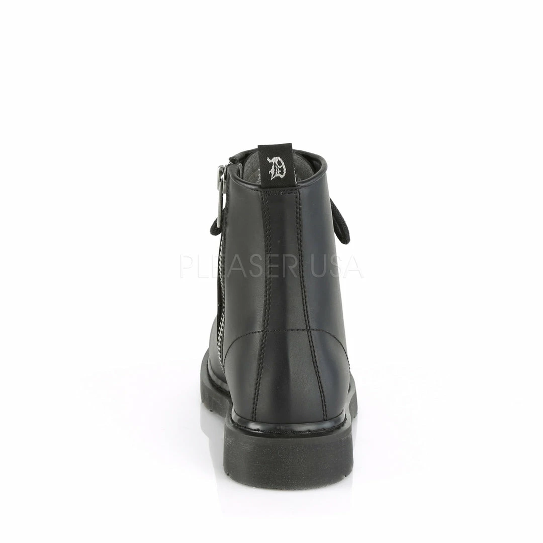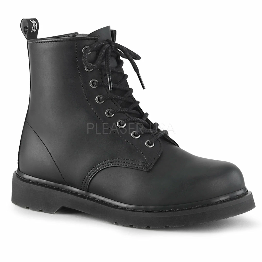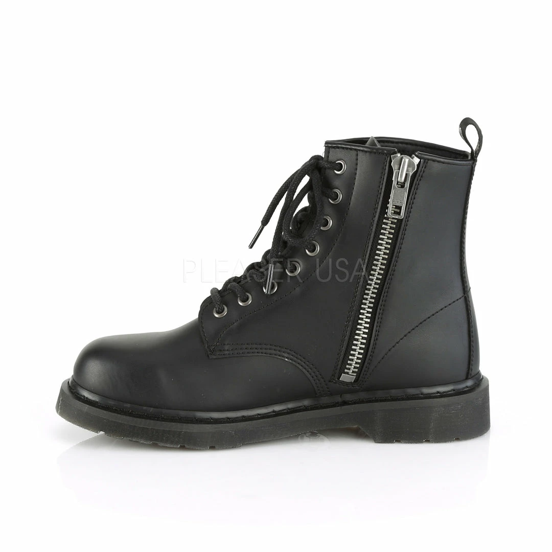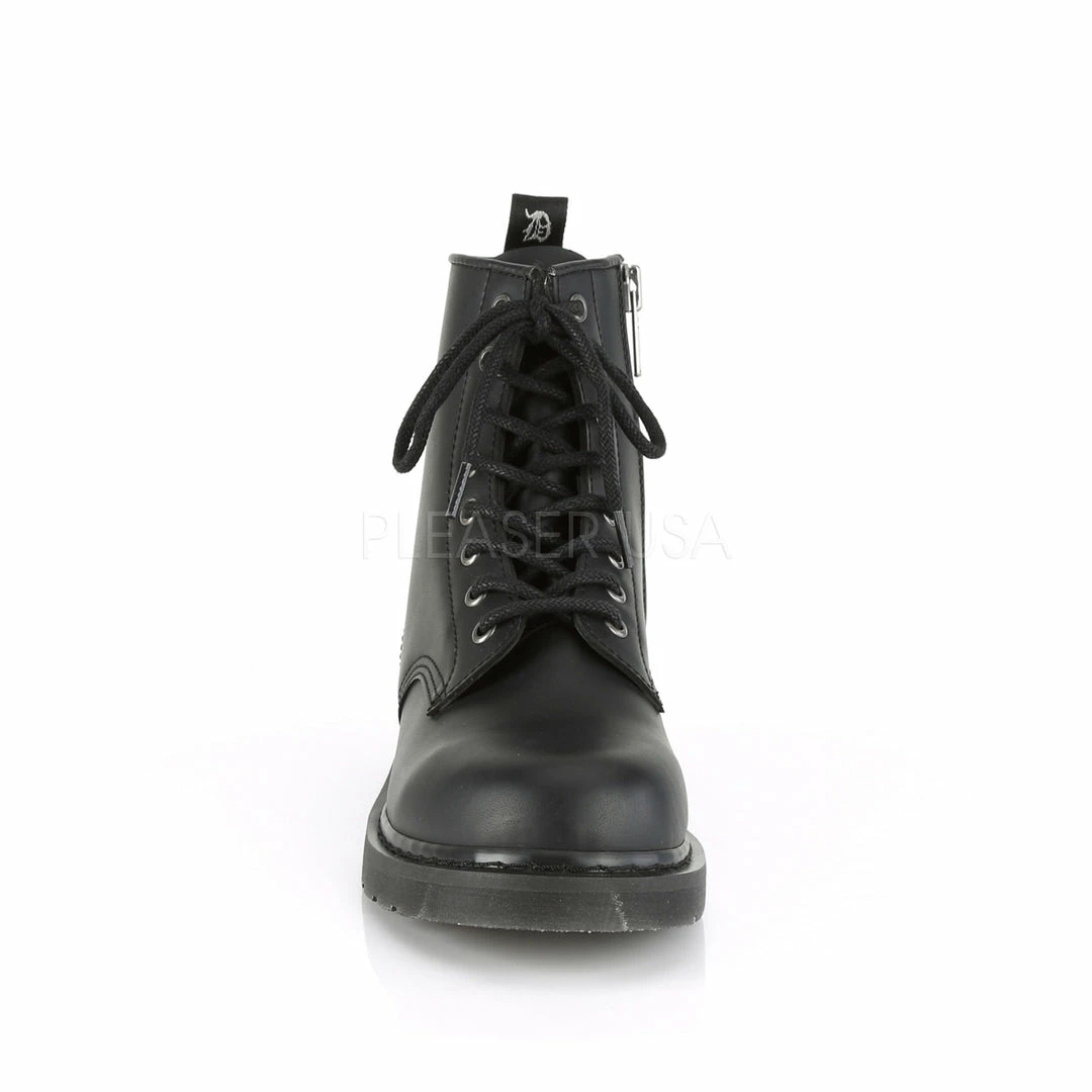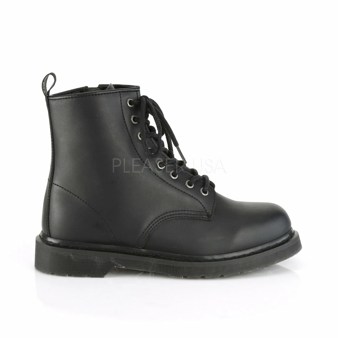 1 1/4″ (25mm) Stacked Flat Heel 8-Eyelet Lace-Up Mid Calf Unisex Vegan Boot w/ Back Pull-Tab, Inside ZIp Closure