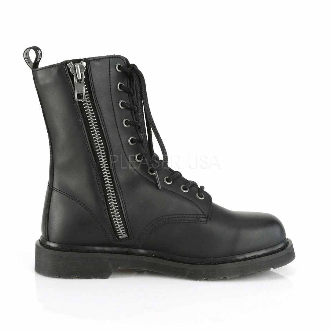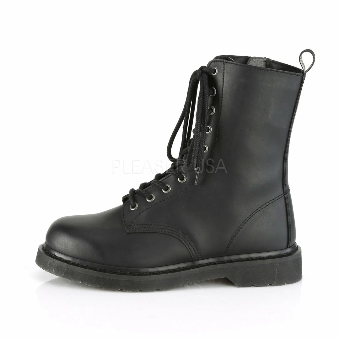 1 1/4″ (32mm) Stacked Flat Heel 10-Eyelet Lace-Up Mid Calf Unisex Vegan Boot w/ Back Pull-Tab, Inside Zip Closure