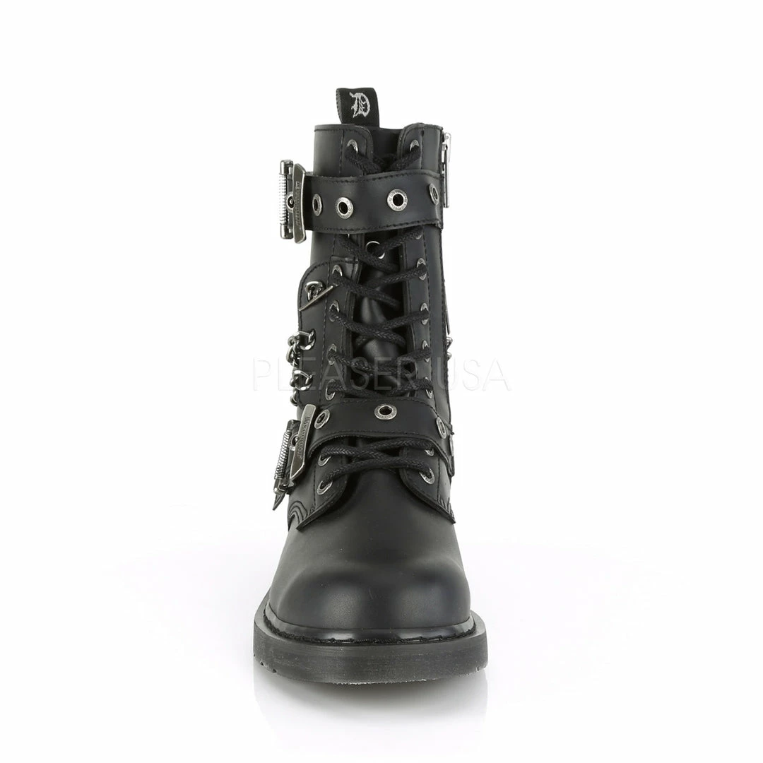 1 1/4″ (32mm) Heel 10 Eyelet Unisex Mid-Calf Combat Boot Featuring Grommet Buckle Straps and Chain Details, Inside Zip Closure