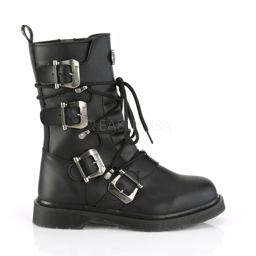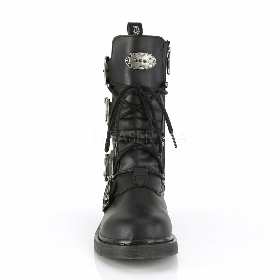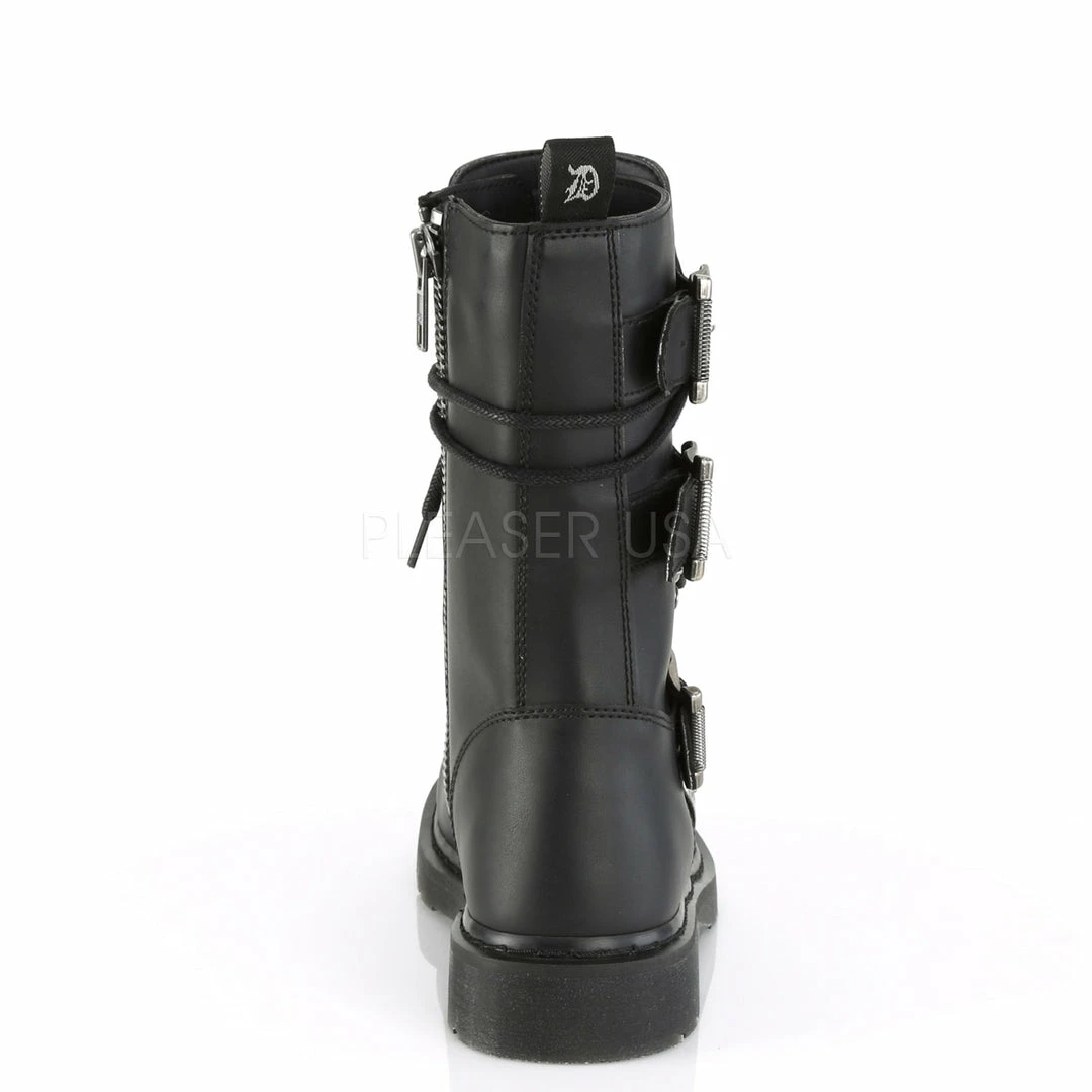 1 1/4″ (32mm) Heel Unisex Mid-Calf Lace-Up Front Combat Boot Featuring Adjustable 4 Buckle Straps, Inside Zip Closure