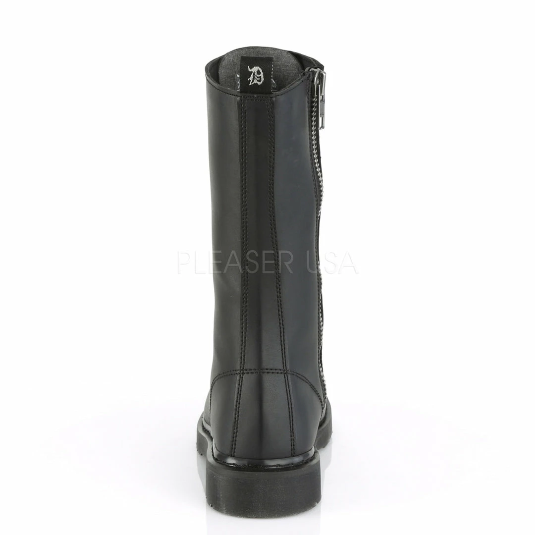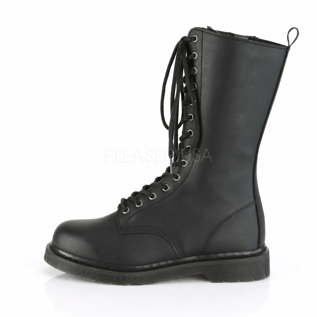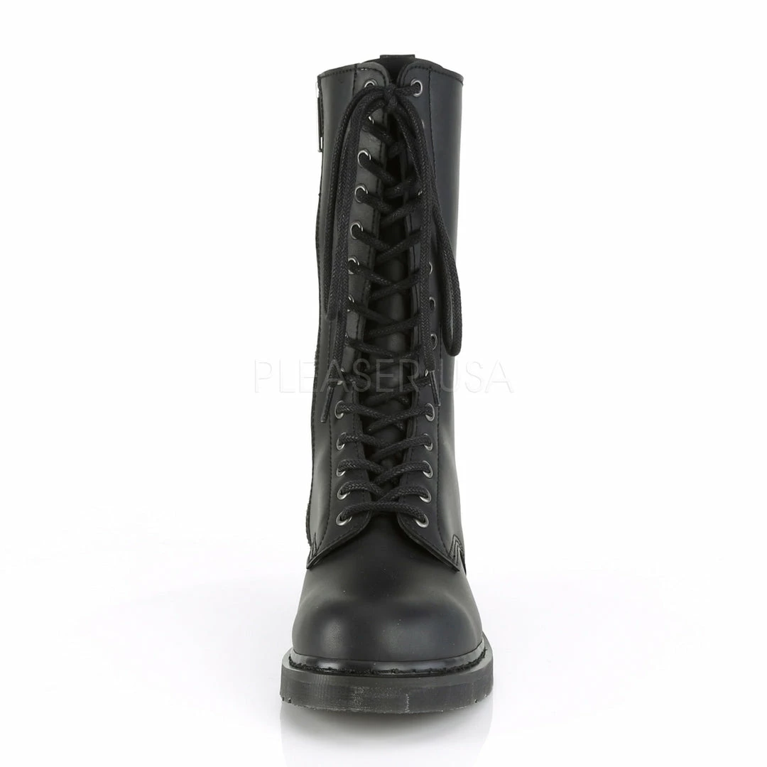 1 1/4″ (32mm) Stacked Flat Heel 14-Eyelet Lace-Up Mid Calf Unisex Vegan Boot w/ Back Pull-Tab, Inside Zip Closure