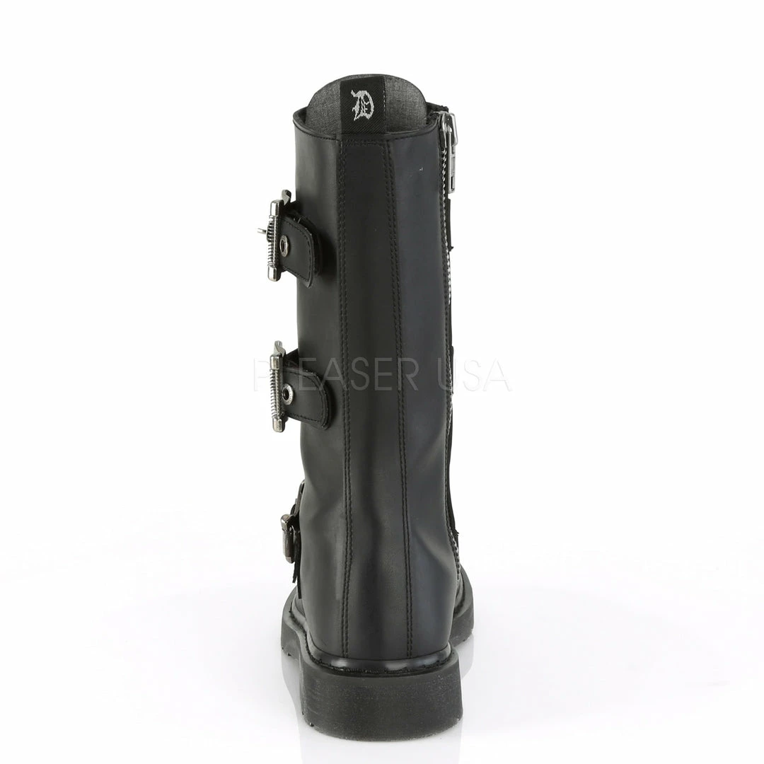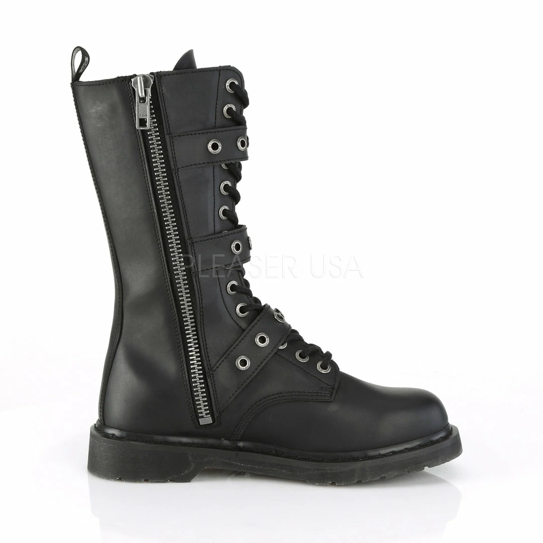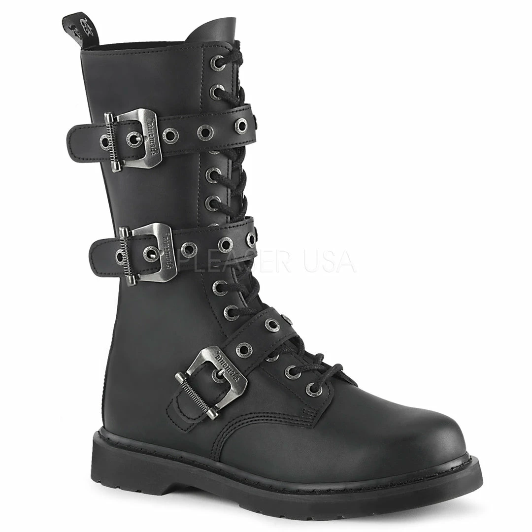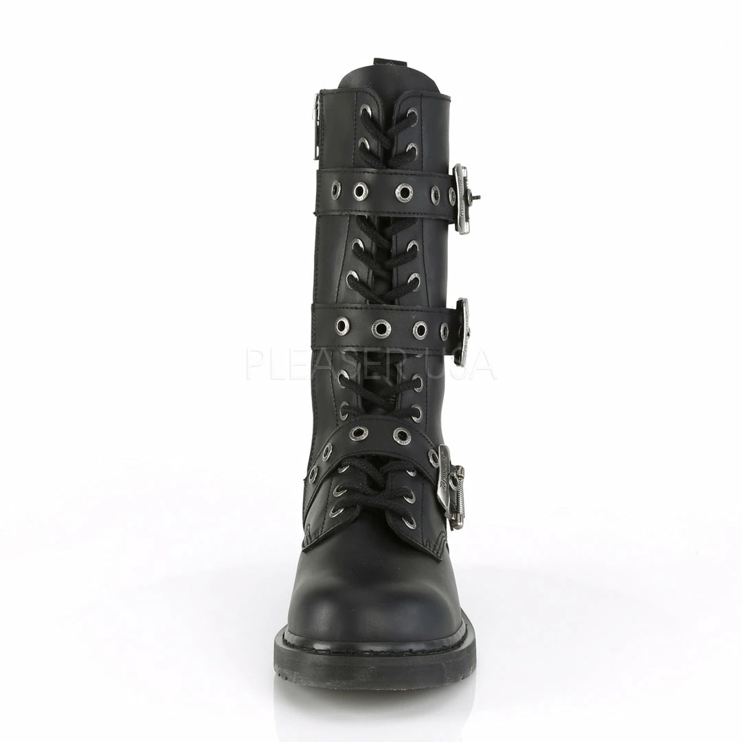 1 1/4″ (32mm) Heel 14 Eyelet Unisex Mid-Calf Combat Boot Featuring Triple Buckle Straps, Inside Zip Closure