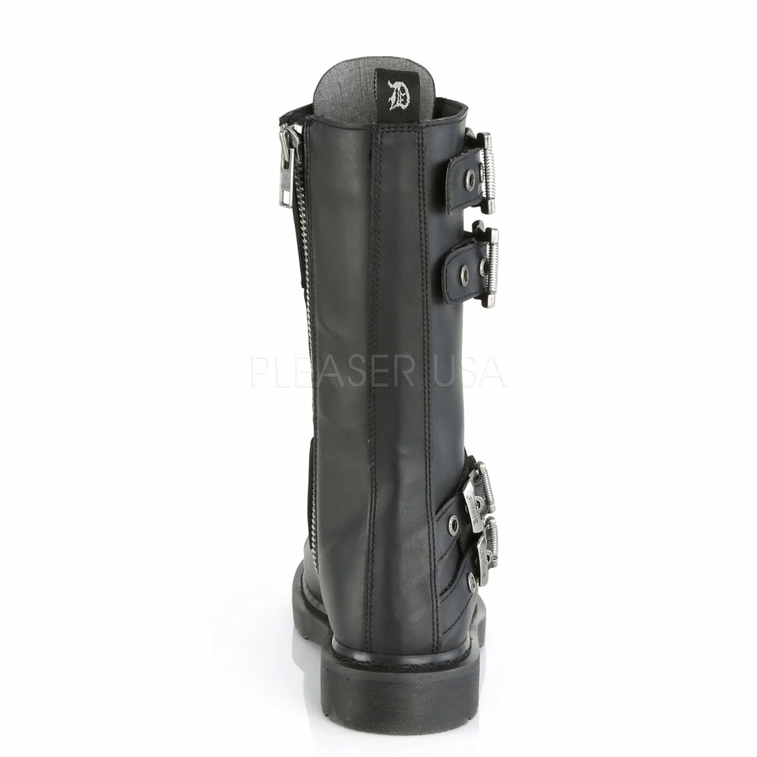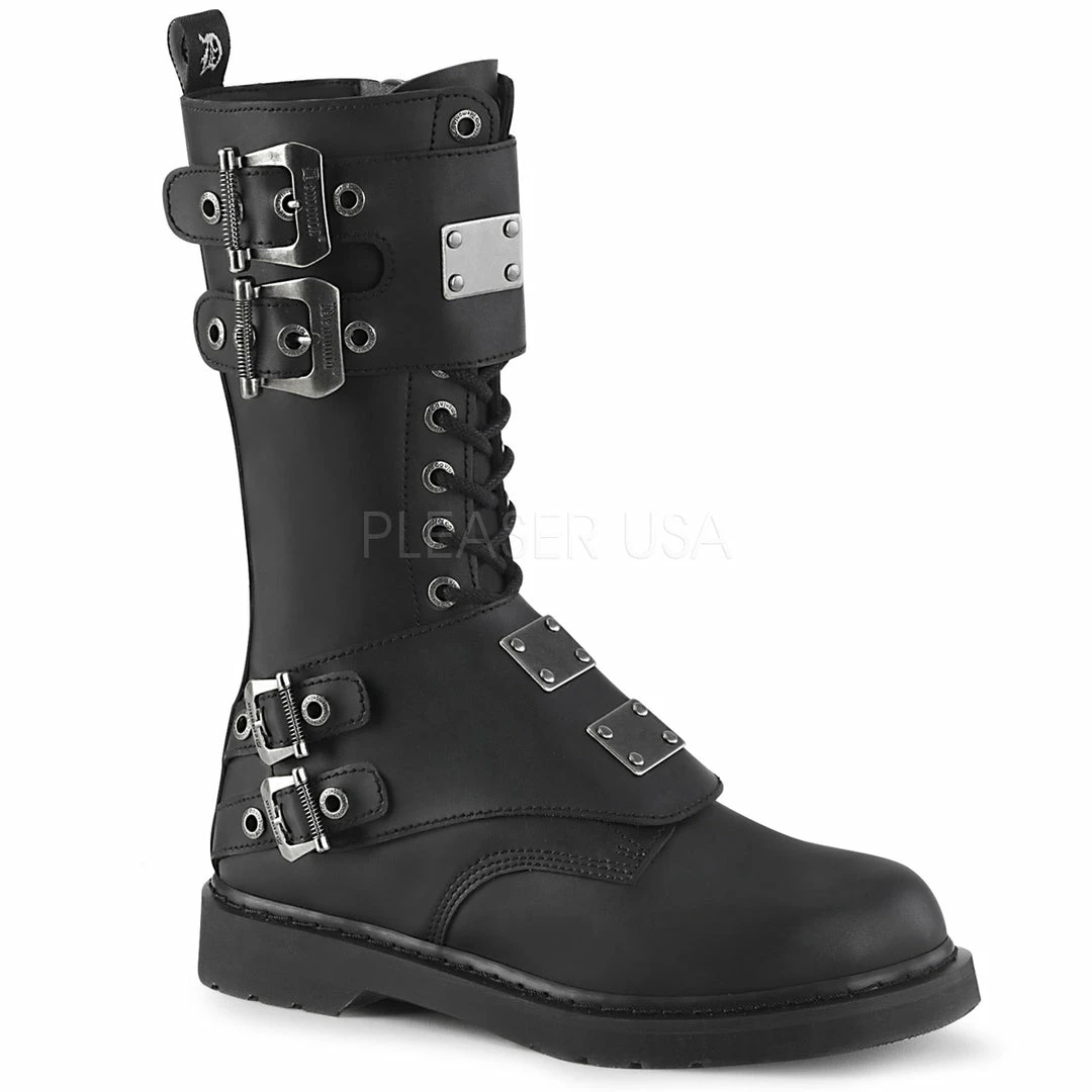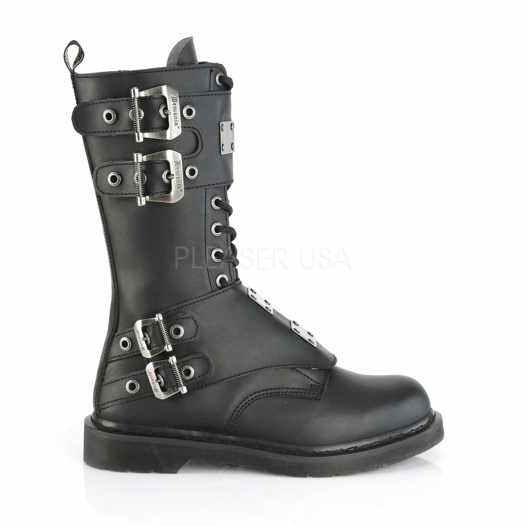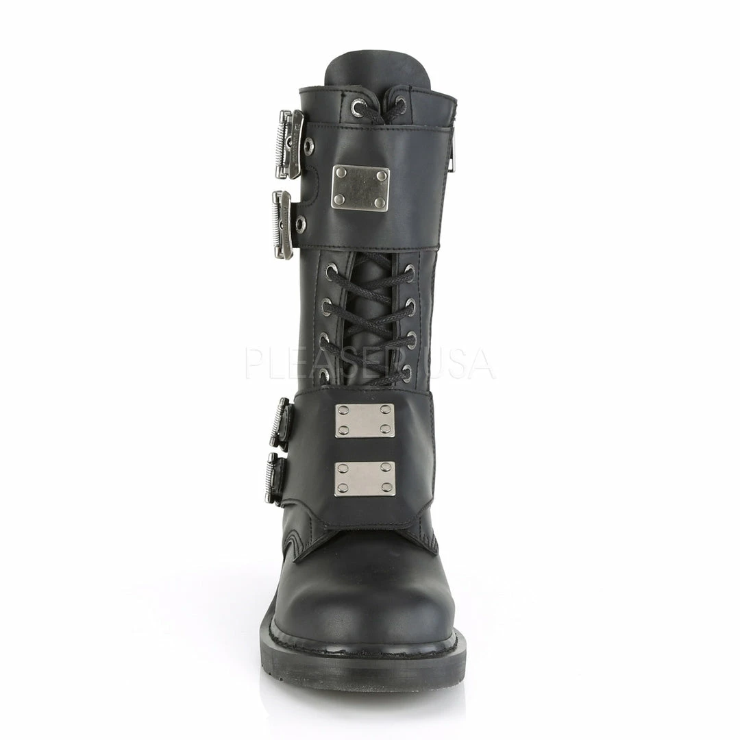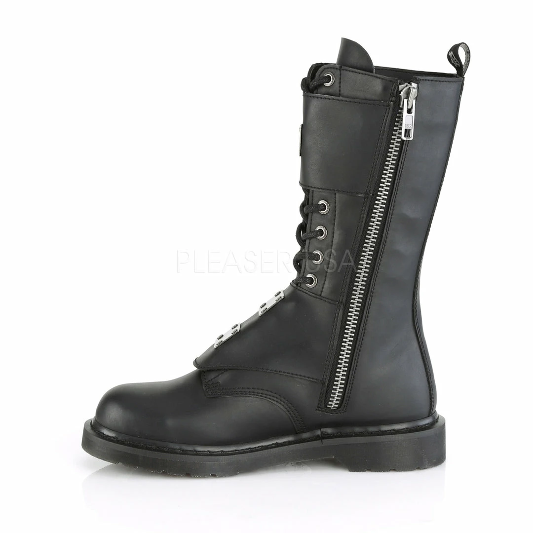 1 1/4″ (32mm) Heel 14 Eyelet Unisex Mid-Calf Combat Boot Featuring Buckled Panels w/ Metal Plate Center, Inside Zip Closure