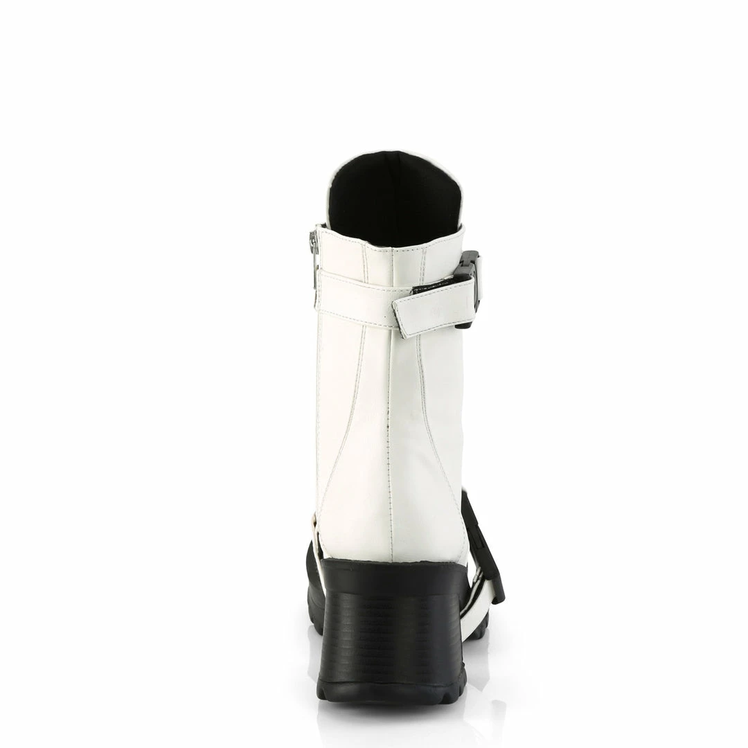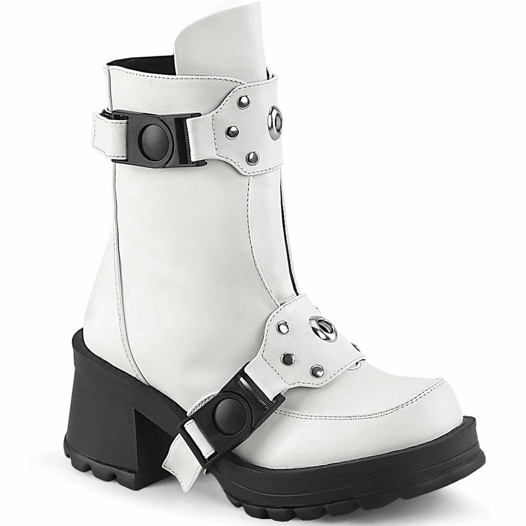 2 3/4″ (70mm) Chunky Heel, 1″ (25mm) Platform Ankle Boot, Featuring Eyelet and Studded Straps w/ Quick Release Plastic Buckle, Inner Side Metal Zip Closure
