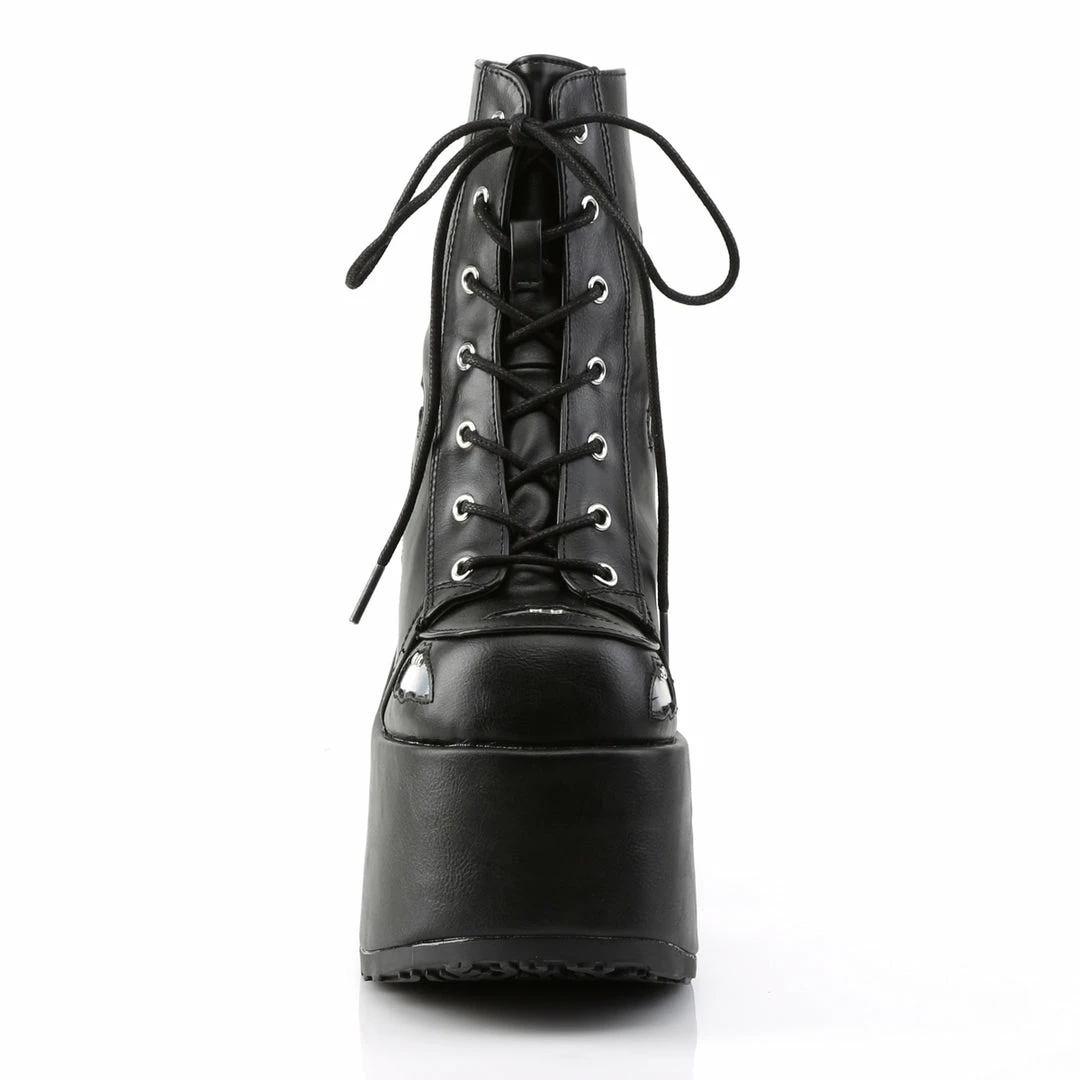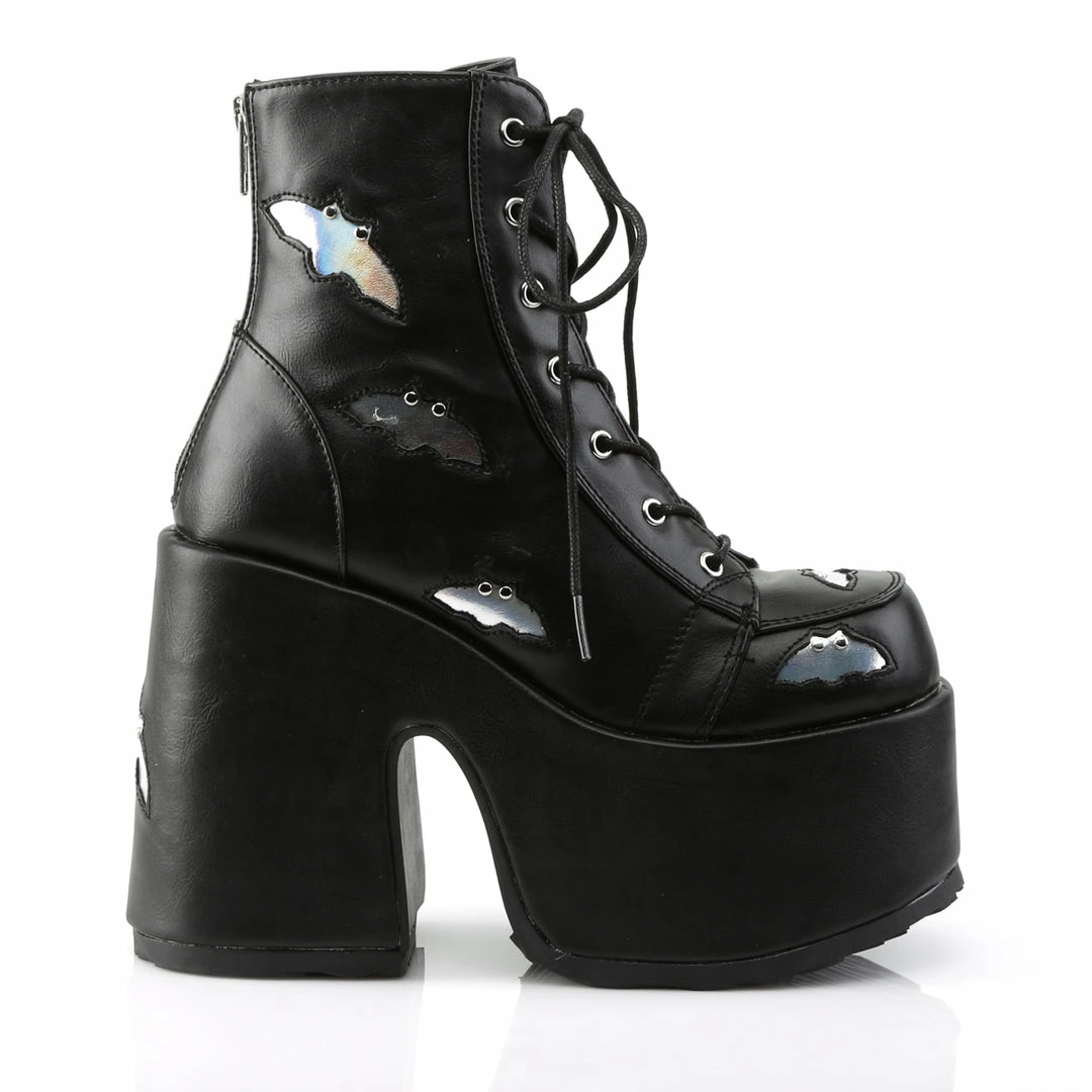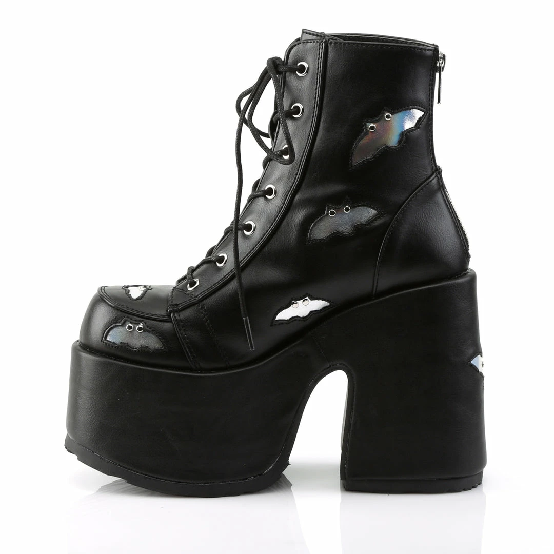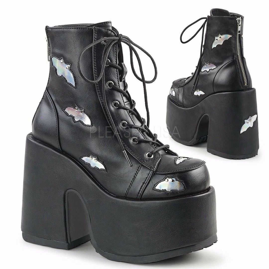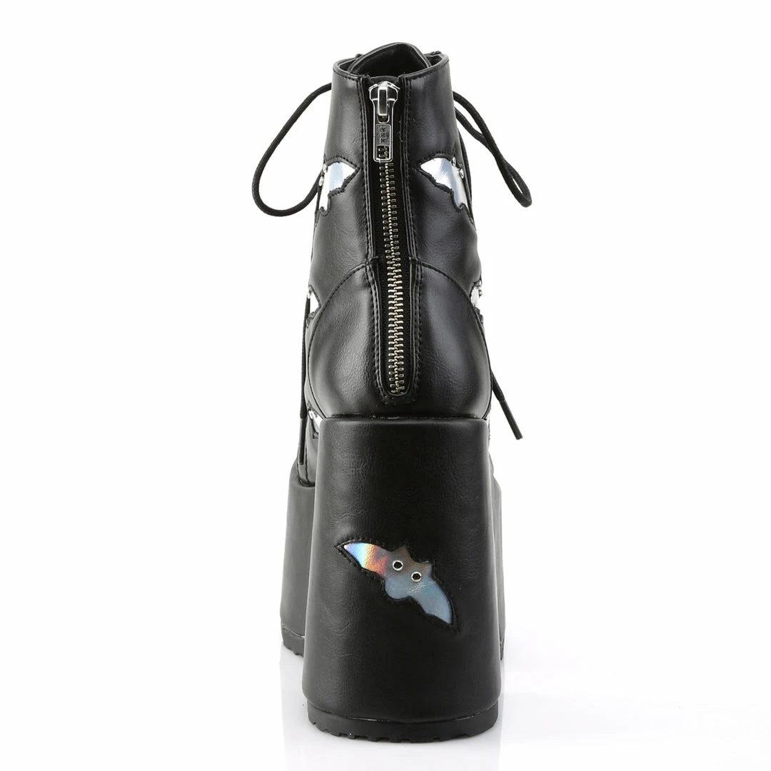 5″ (12.7cm) Chunky Heel, 3″ (7.6cm) P/F Lace-Up Ankle Boot Featuring Studded Black Bats on Vamp and Heel, Metal Back Zip