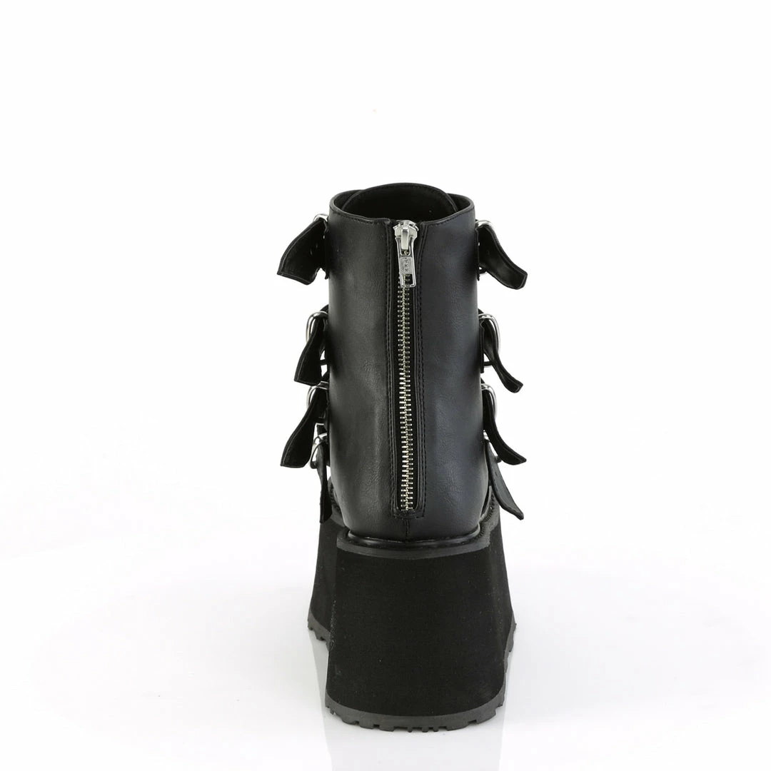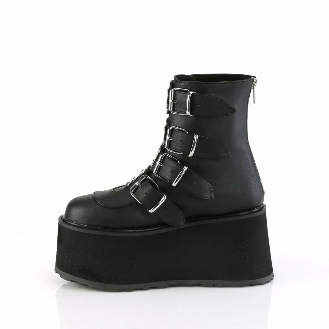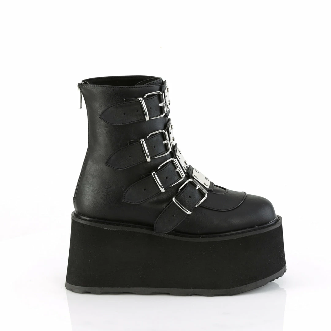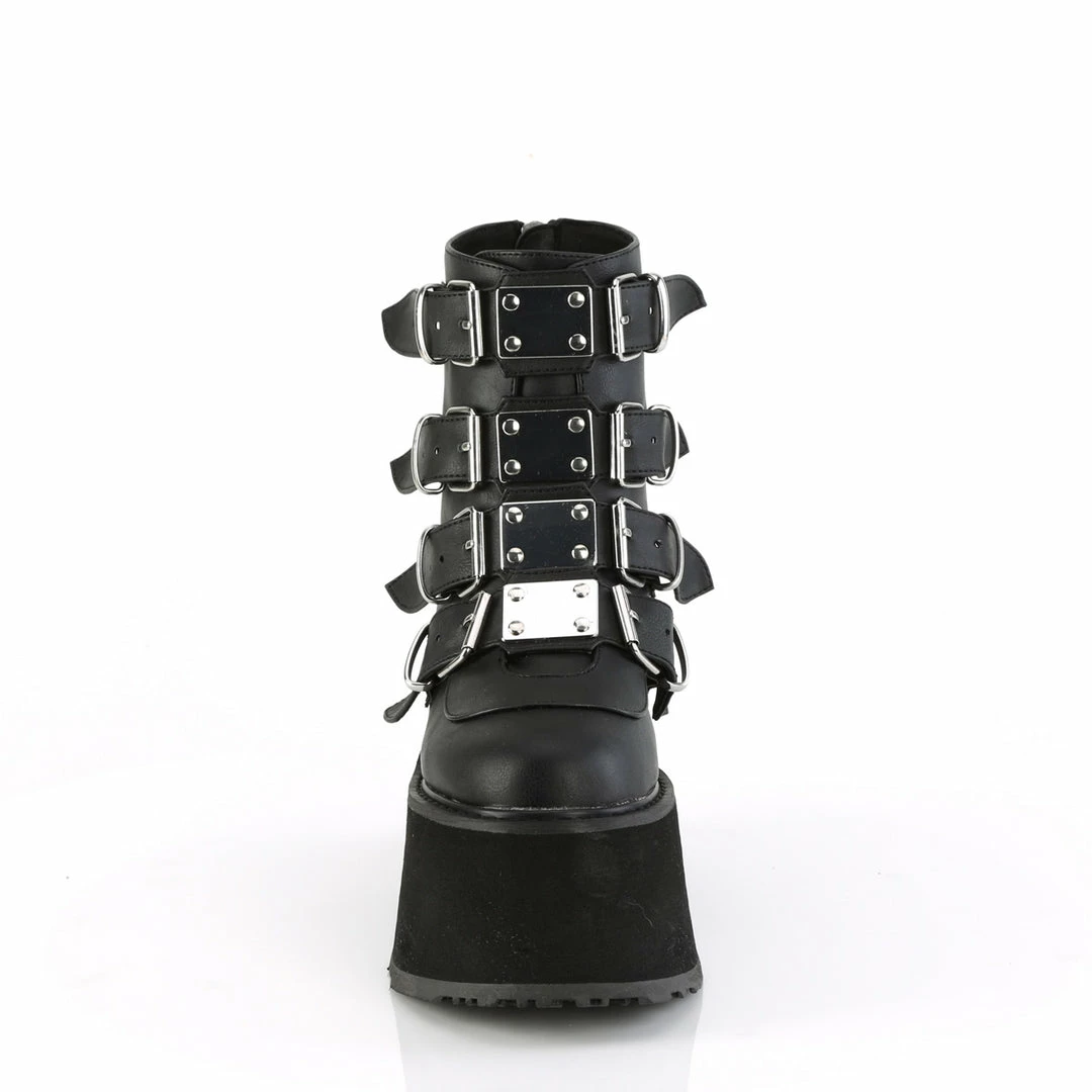 3 1/2″ (90mm) Platform Ankle Boot Featuring Quadruple Buckle Straps w/ Metal Plates at Center, Back Metal Zip Closure