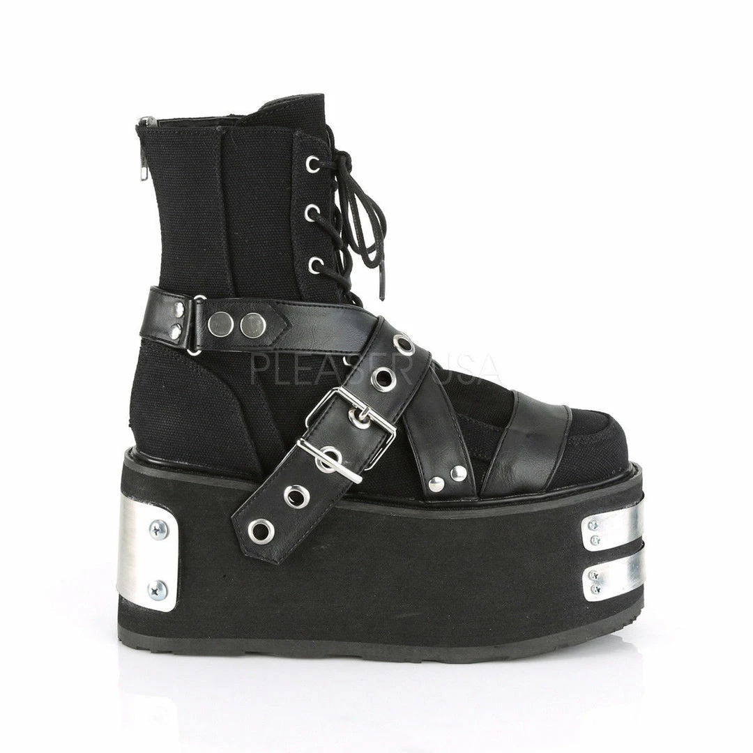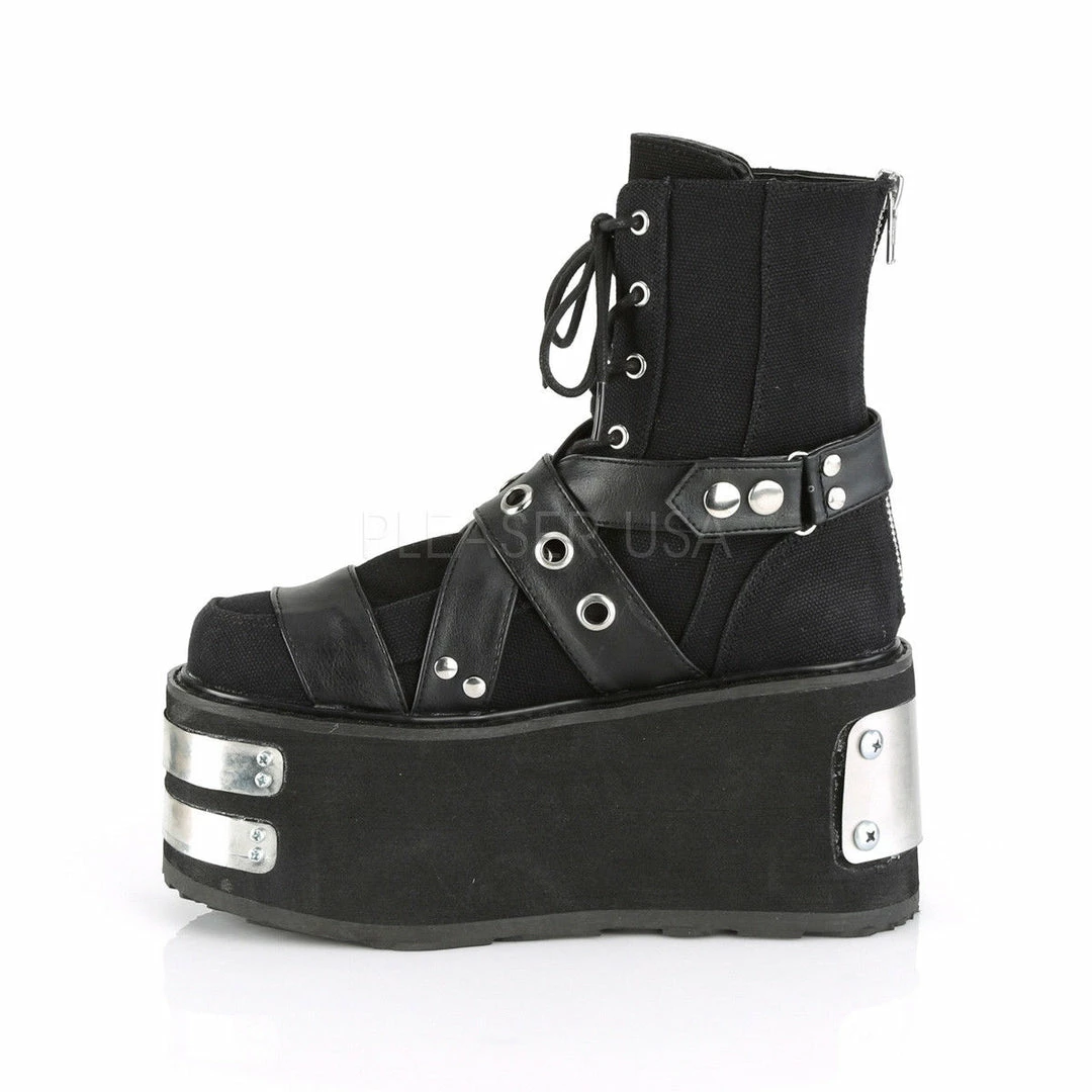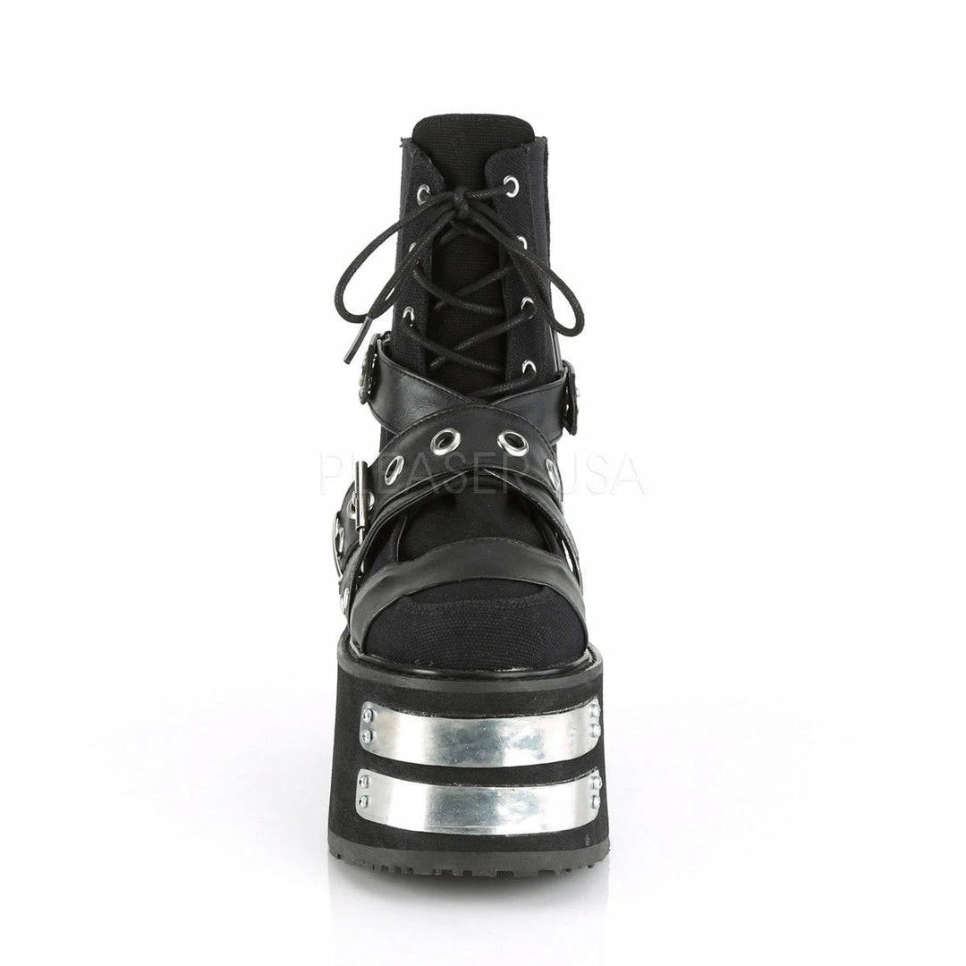 3 1/2″ (90mm) Front & Back Metal Plated Platform Lace-Up Ankle Boot Featuring Harness Style Snap-On Criss-Cross Straps & Grommet Buckle Strap, Back Zip Closure