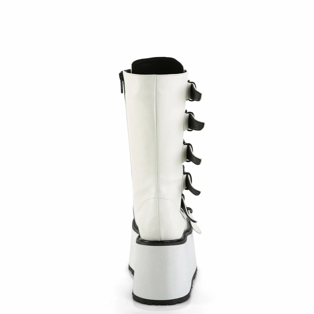3 1/2″ (90mm) Platform Lace-Up Front Mid-Calf Boot Featuring 6 Cone-Studded Buckle Straps, Inside Metal Zip Closure