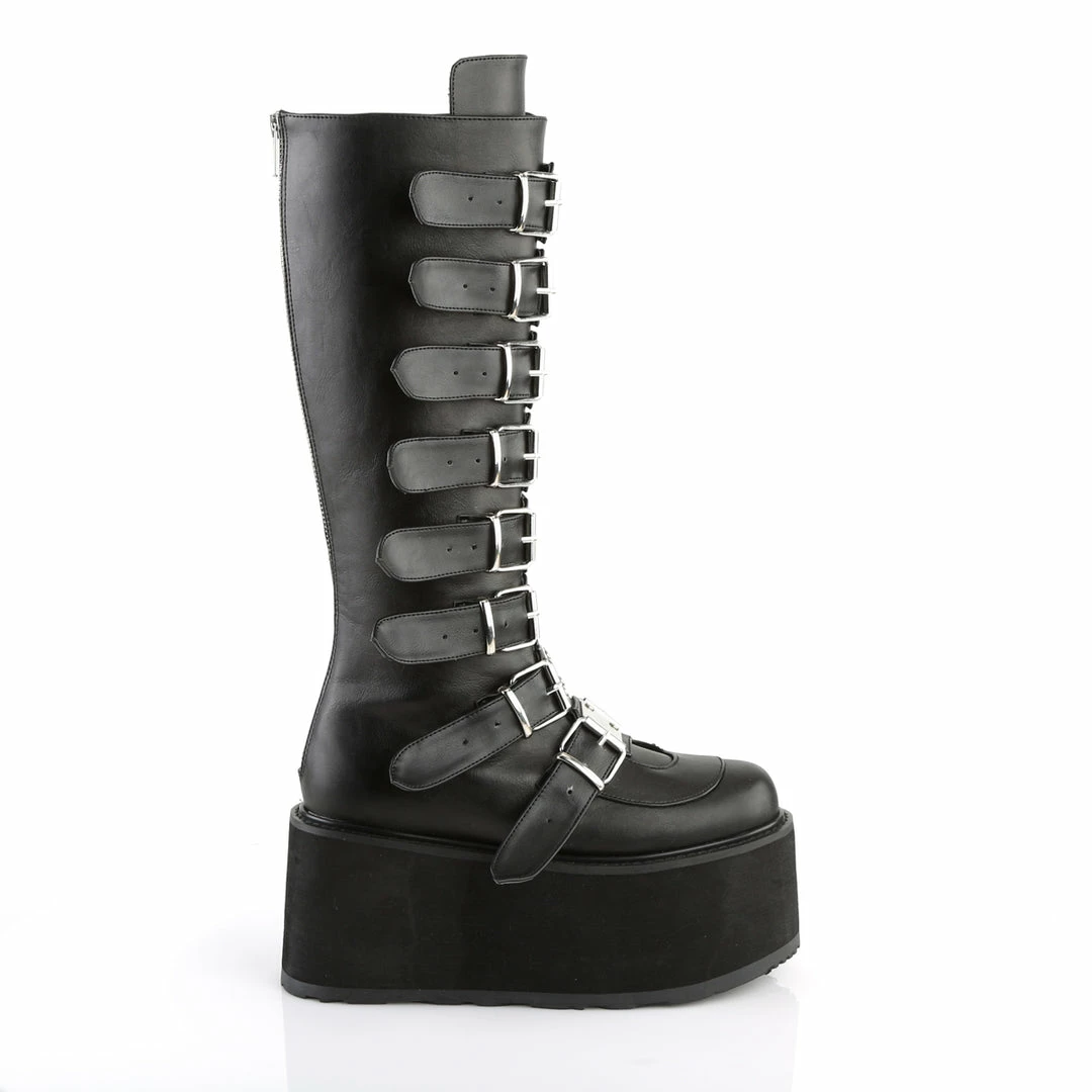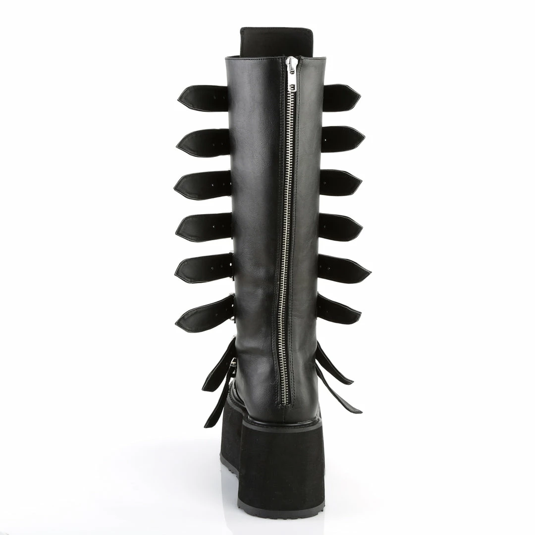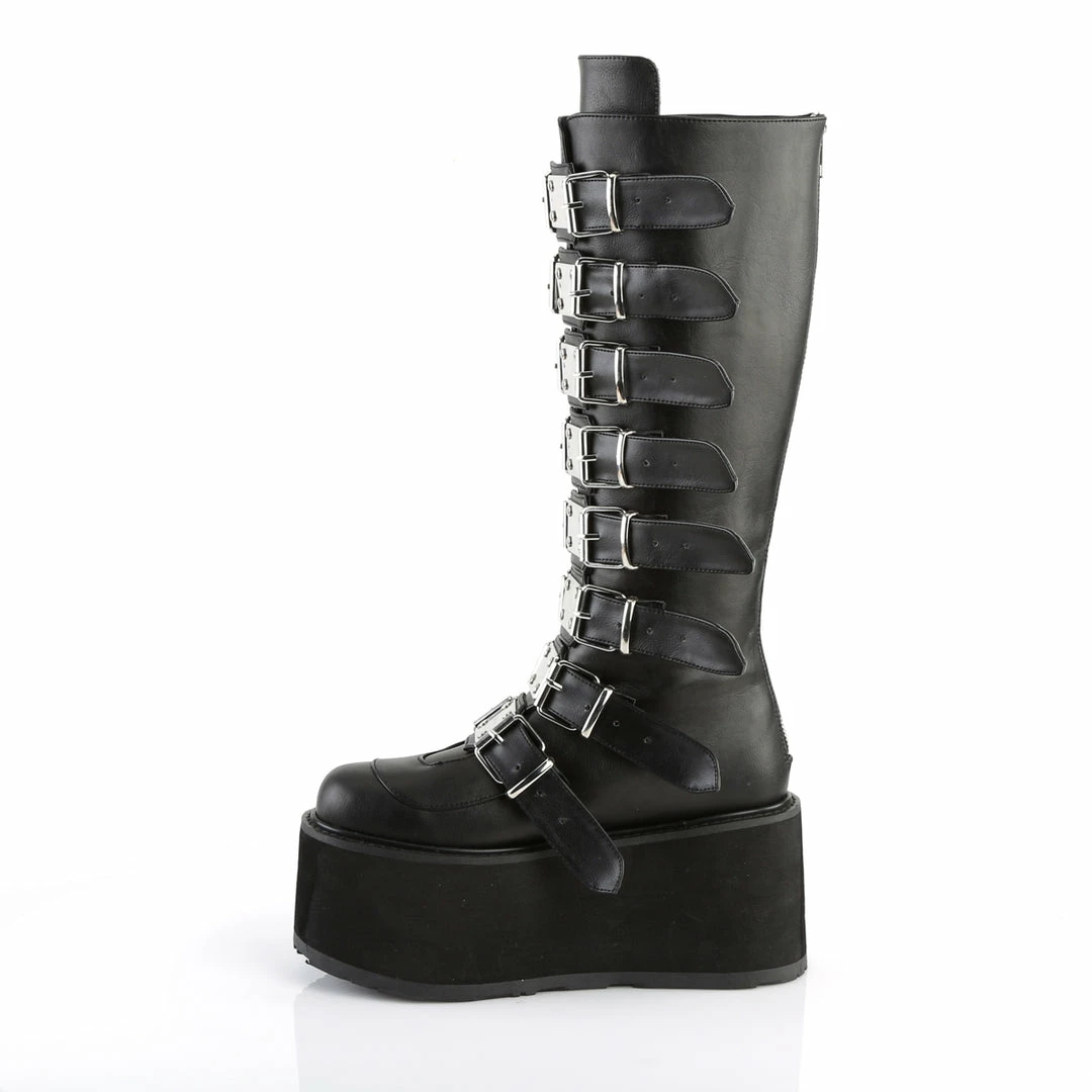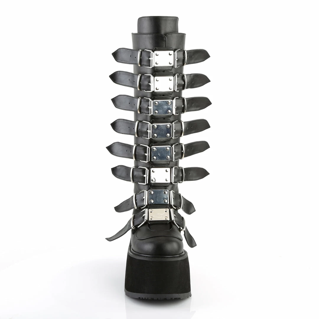 3 1/2″ (90mm) Platform Knee High Boot Featuring 8 Buckle Straps w/ Metal Plates at Center, Back Metal Zip Closure