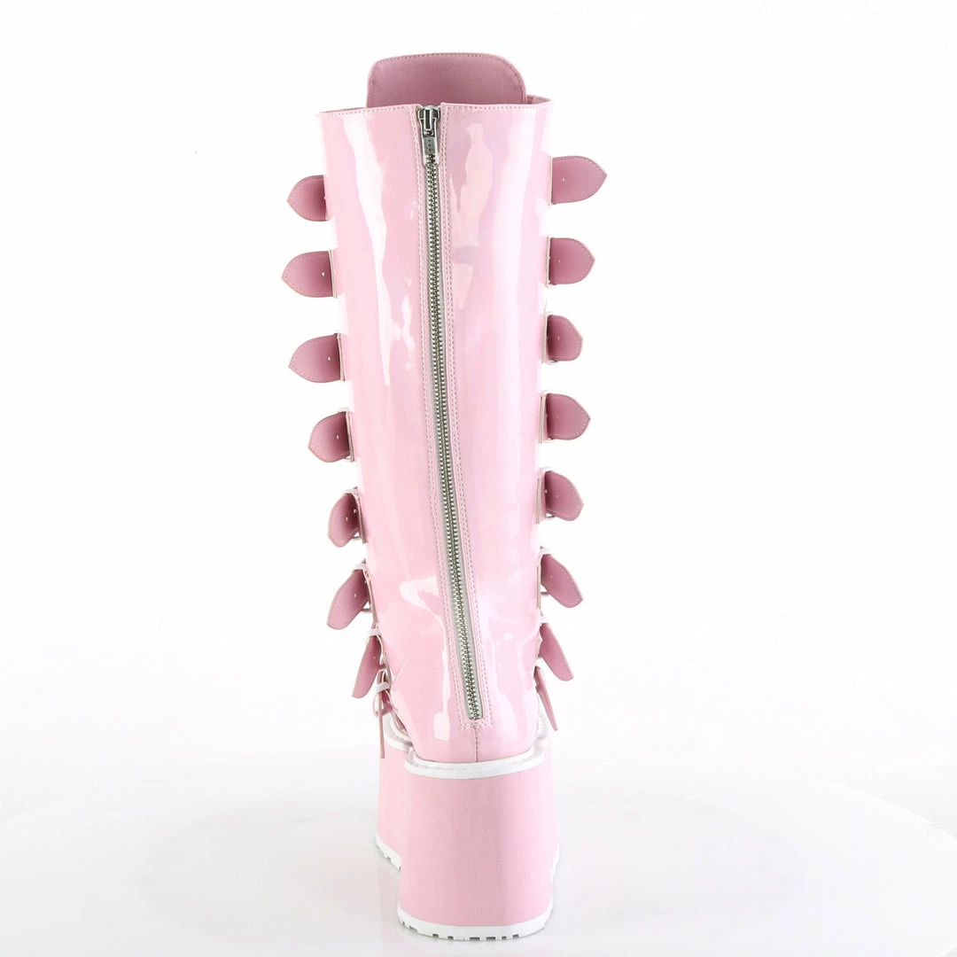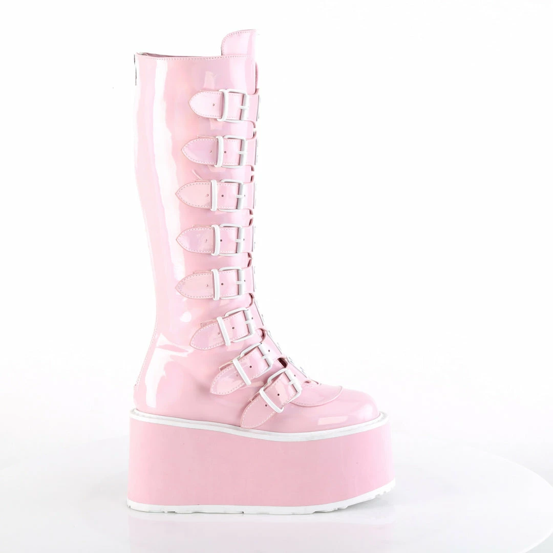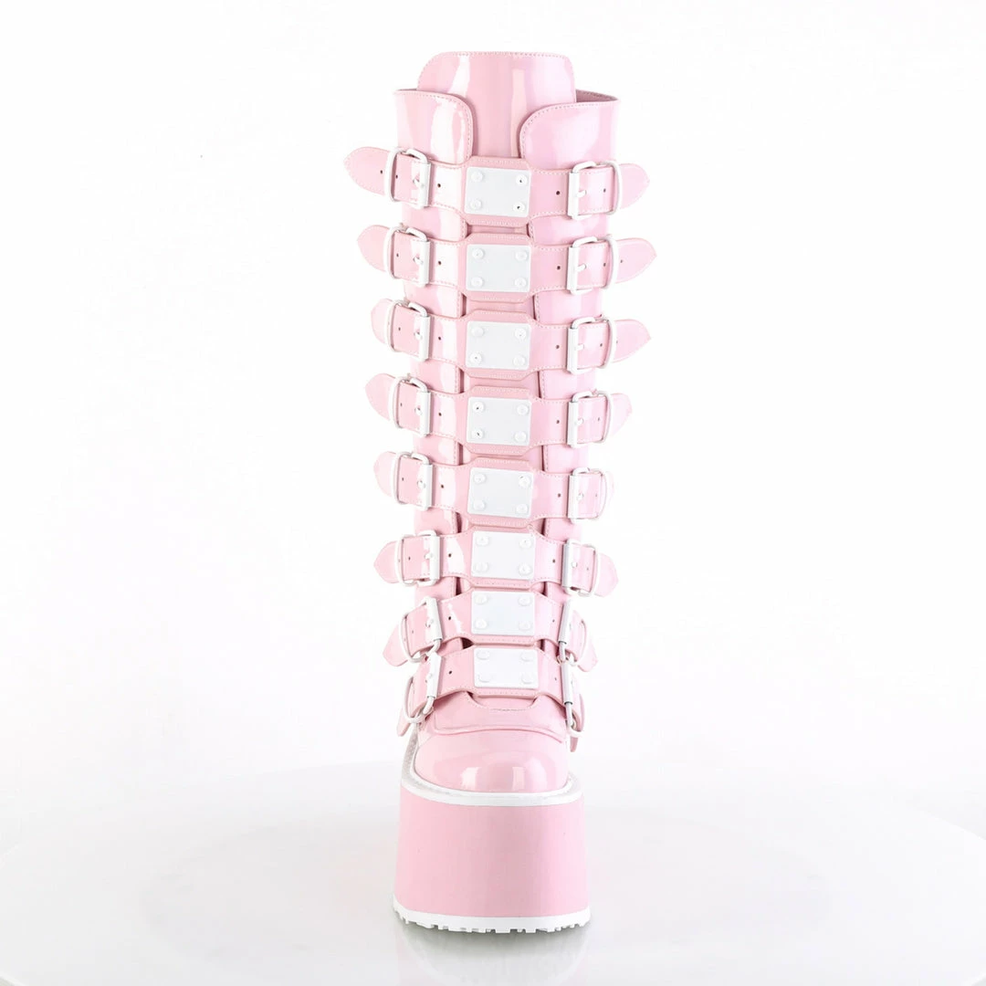 3 1/2″ (90mm) Platform Knee High Boot Featuring 8 Buckle Straps w/ Metal Plates at Center, Back Metal Zip Closure