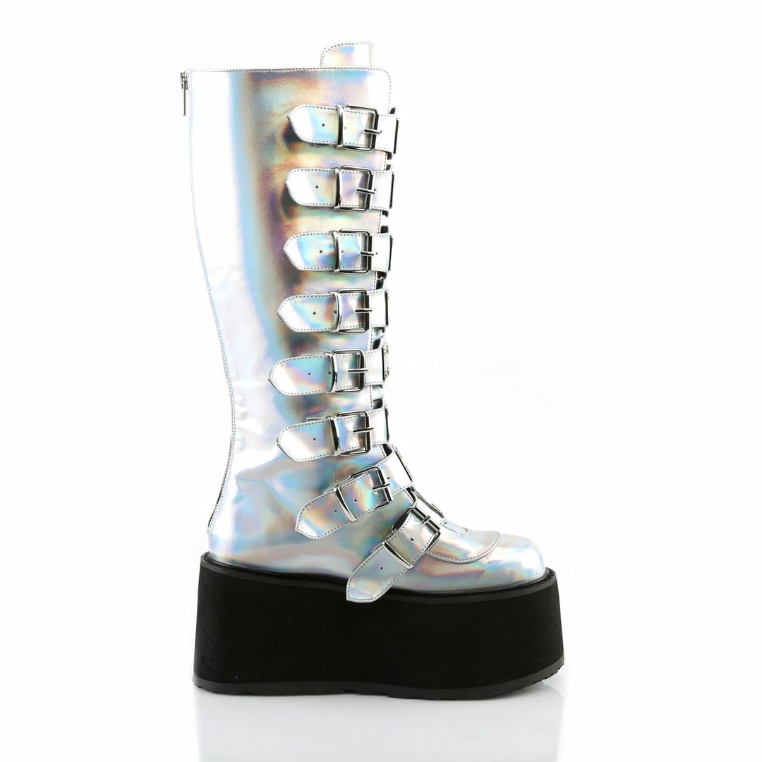 3 1/2″ (90mm) Platform Knee High Boot Featuring 8 Buckle Straps w/ Metal Plates at Center, Back Metal Zip Closure