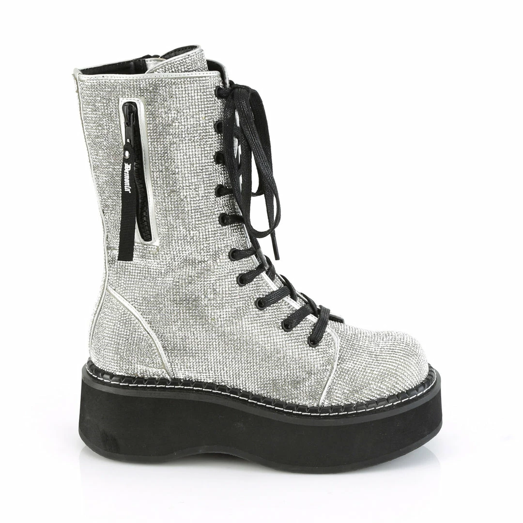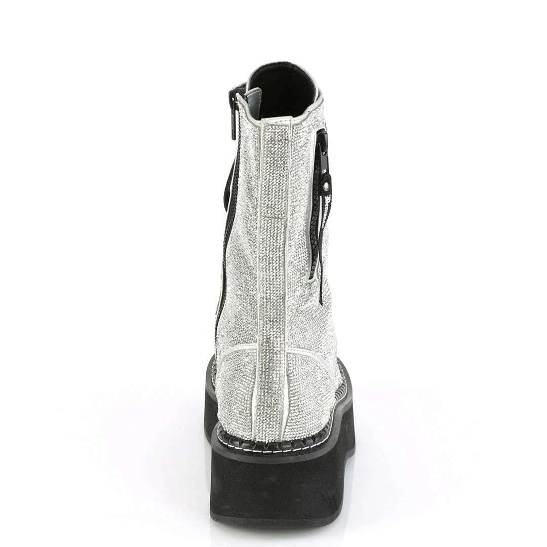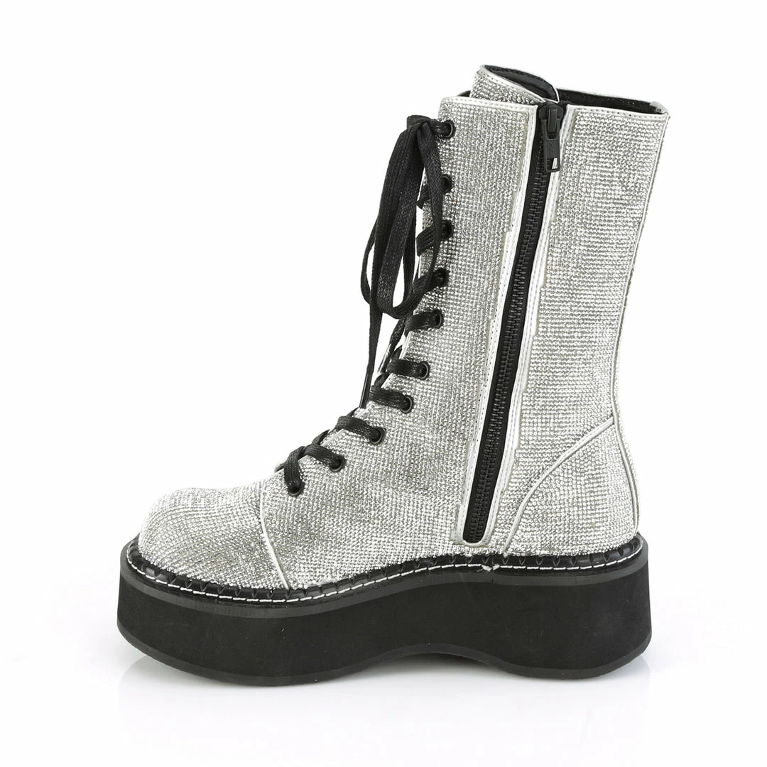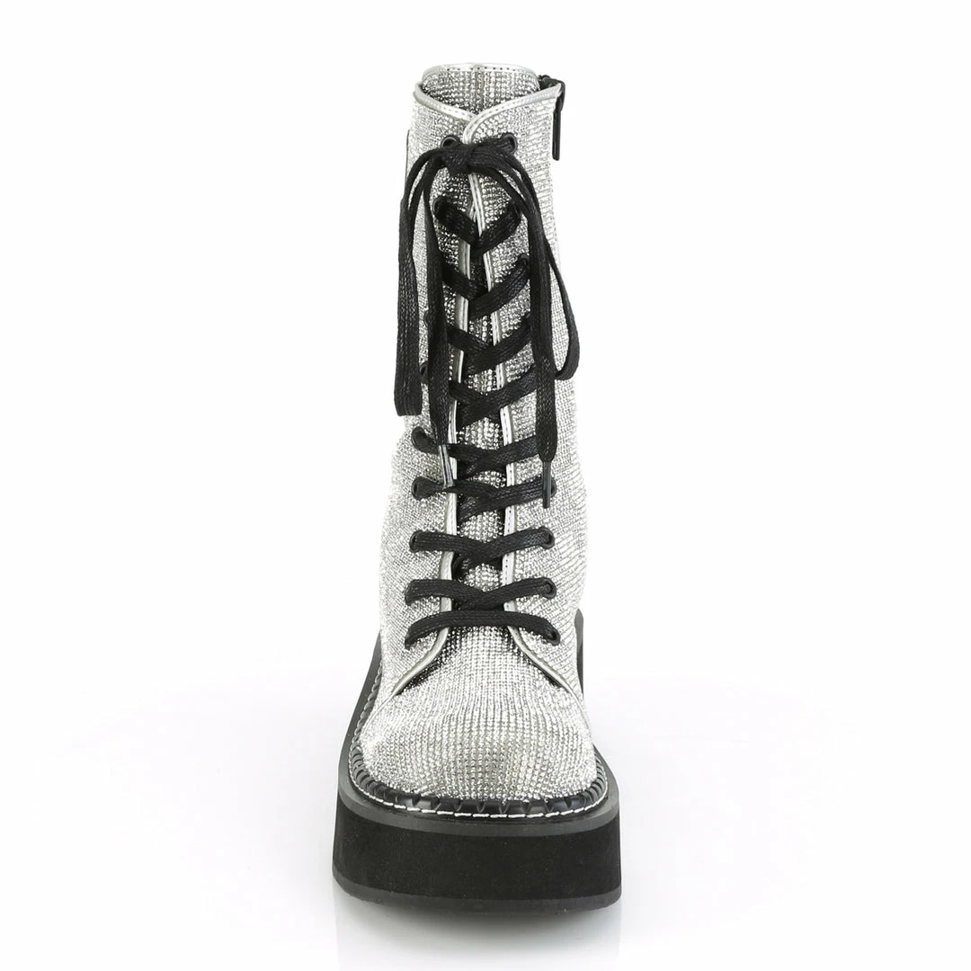 2″ Platform Mid-Calf Lace-Up Boot Featuring Rinestone Covered Upper & Outer Metal Zip Closure Pocket, Inner Side Metal Zip Closure