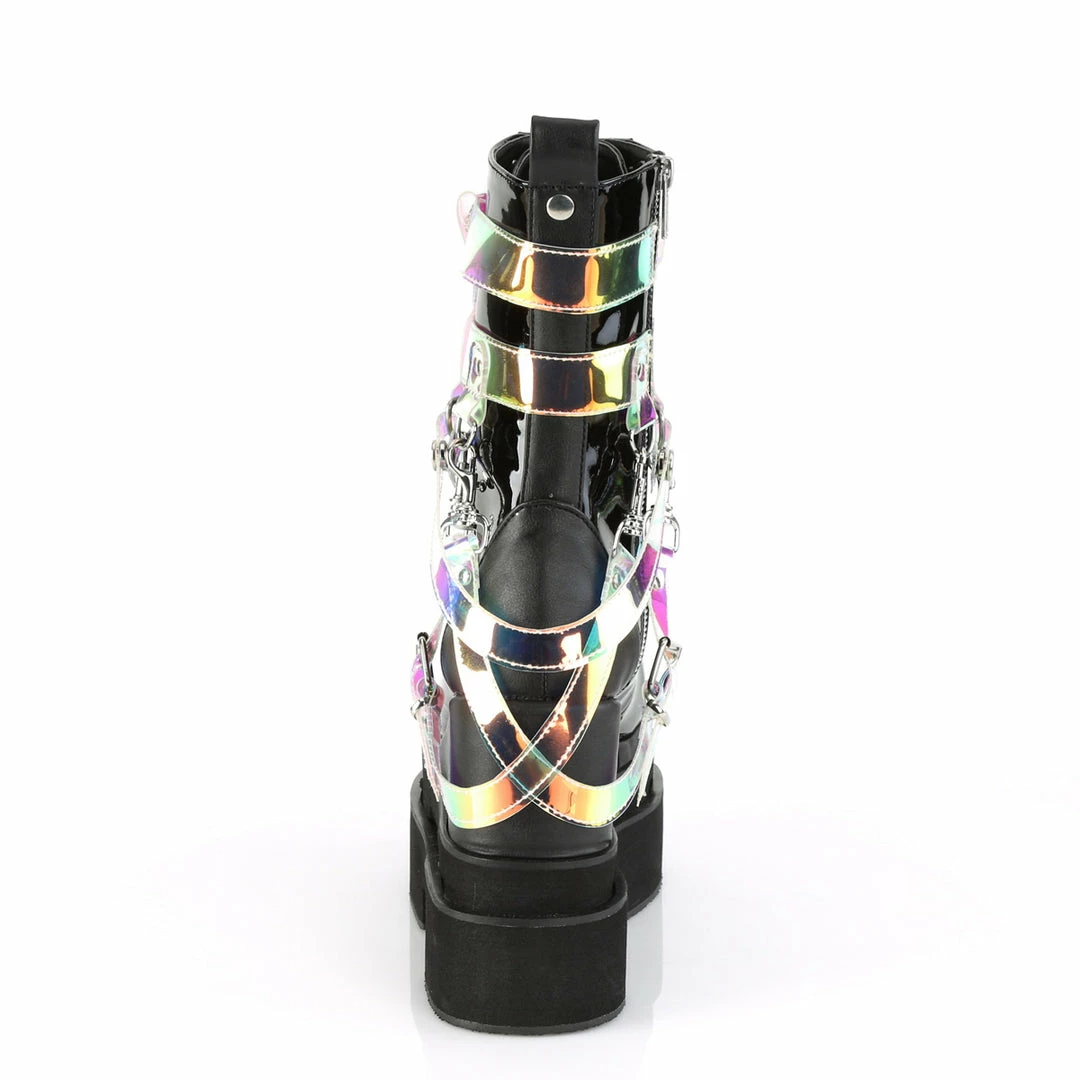 5″ (127mm) Triple Tiered Wedge Cutout PF Lace-Up Front Mid-Calf Boot Featuring Magic Mirror PVC Harness w/ Hanging Bondage Straps, Metal Inner Side Zip Closure
