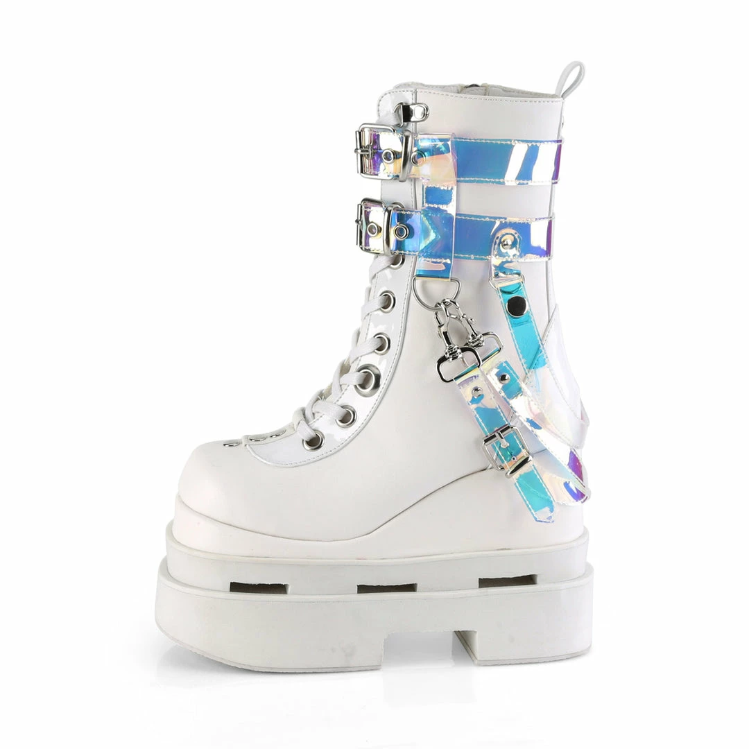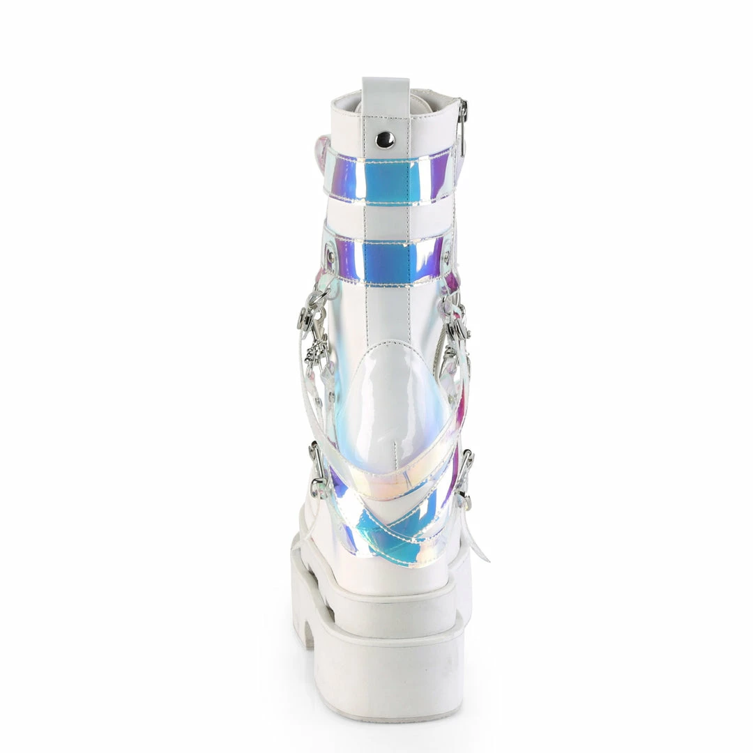 5″ (127mm) Triple Tiered Wedge Cutout PF Lace-Up Front Mid-Calf Boot Featuring Magic Mirror PVC Harness w/ Hanging Bondage Straps, Metal Inner Side Zip Closure