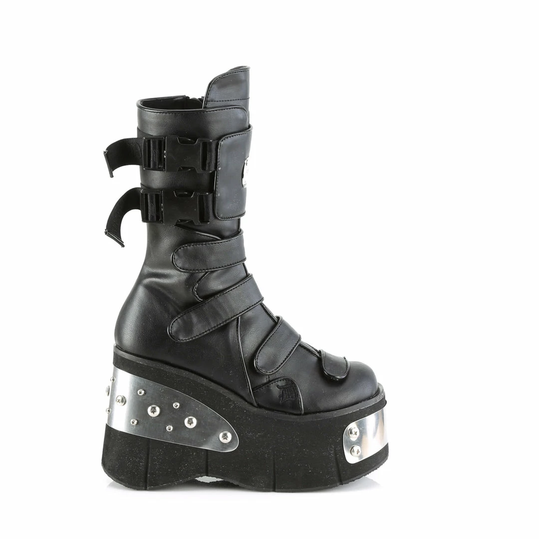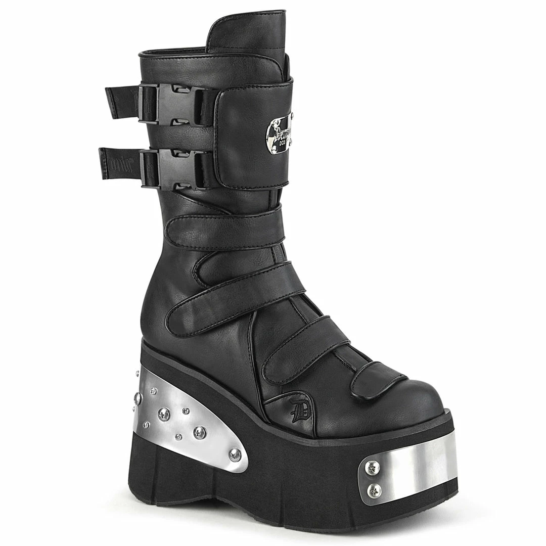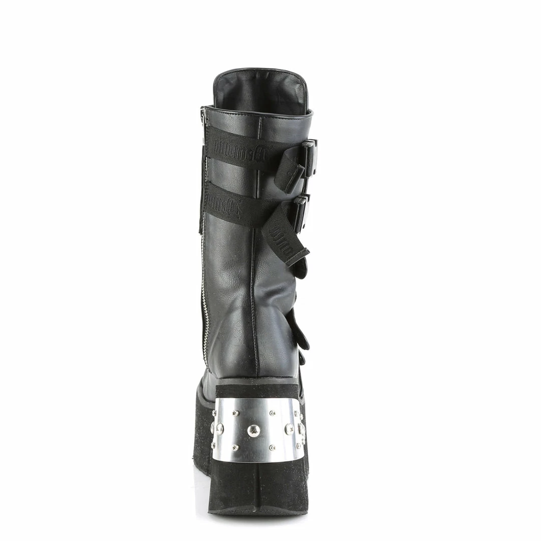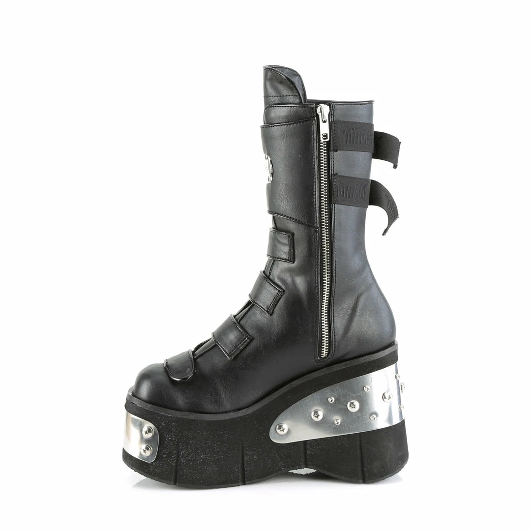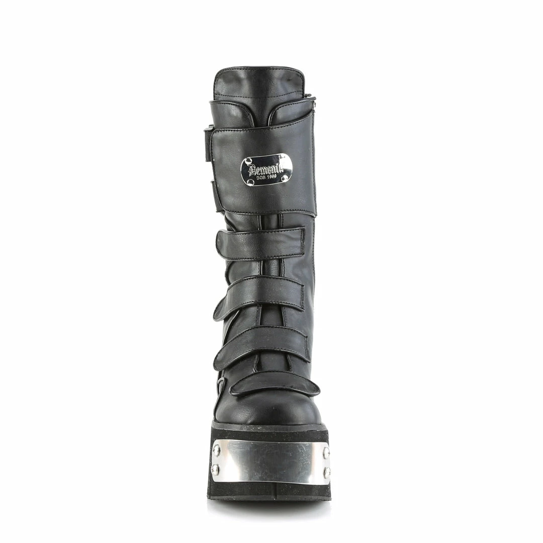 4 1/2″ (114mm) Front & Back Metal Plated Platform Strappy Mid-Calf Boot Featuring Front Sheild w/ Branded Metal Plate Center Detail & Dual Snap Buckles and Hook & Loop Straps on the Remaining Straps, Full Length Inner Side Metal Zip Closure