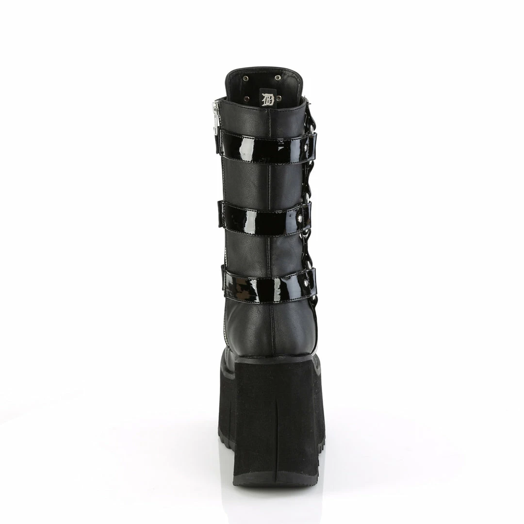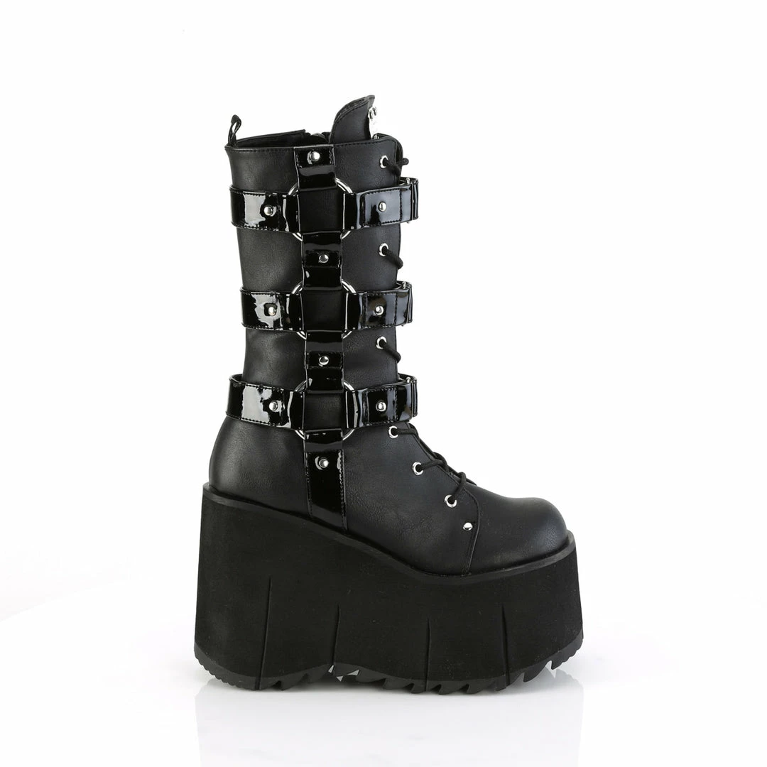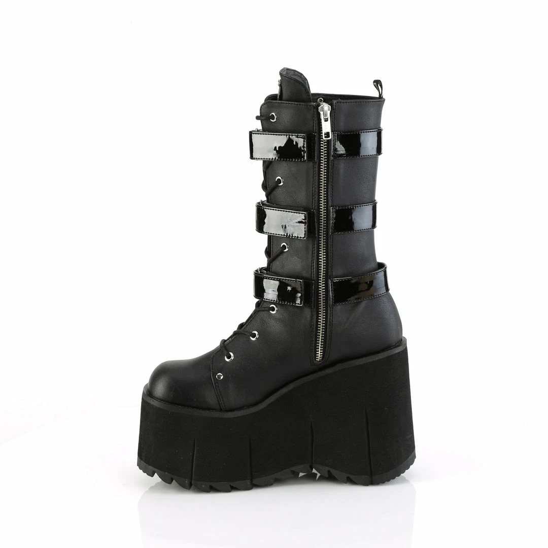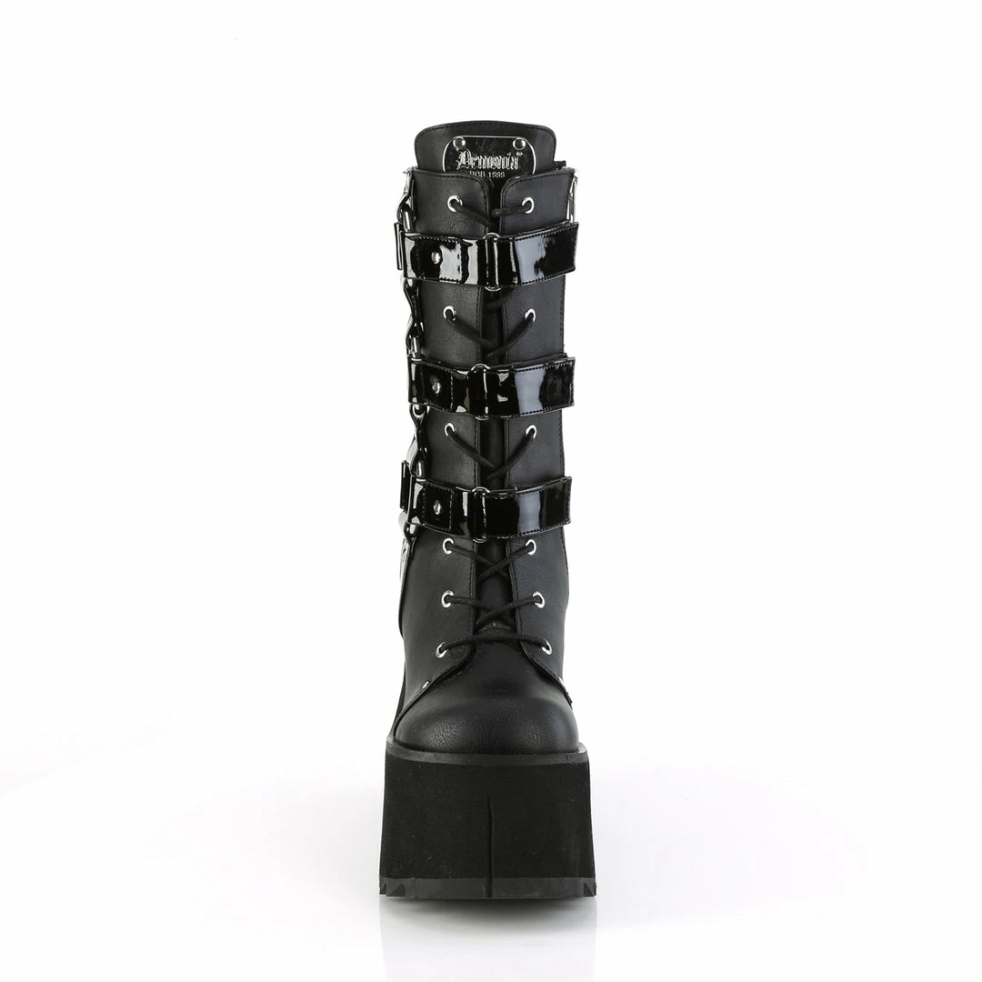 4 1/2″ (114mm) Platform Lace-Up Mid-Calf Boot Featuring Outer Side Studded Harness Detail w/ Adjusting Inner Side Hook N Straps & Branded Metal Plate on Tongue, Inner Side Metal Zip Closure