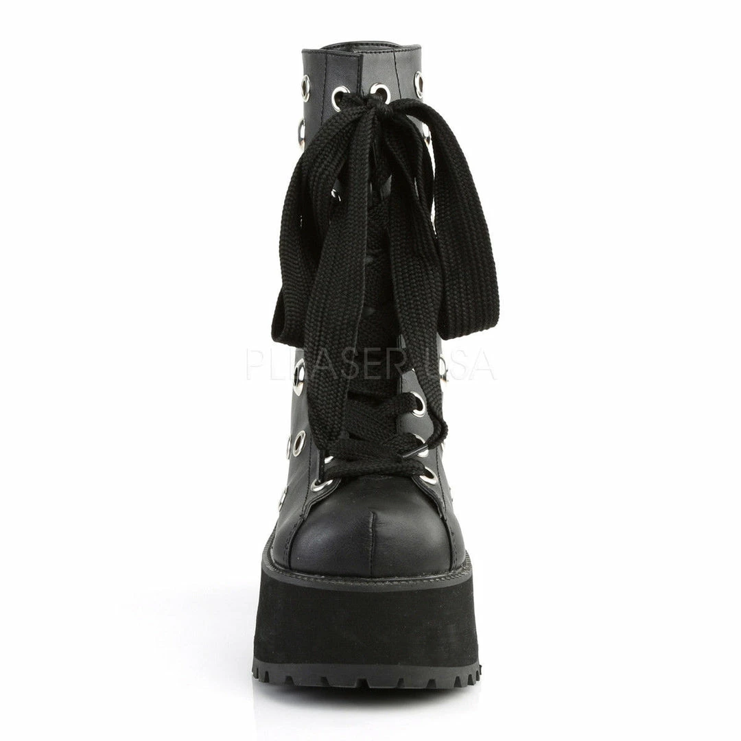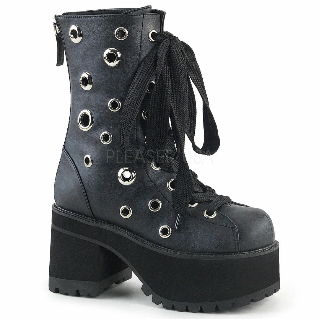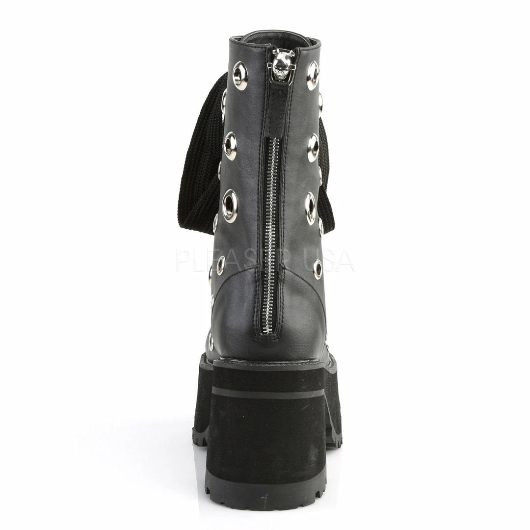 3 3/4″ (95mm) Heel, 2 1/4″ (57mm) Platform Lace-Up Front Ankle Boot Featuring Multi-Size Eyelets on Upper, and 1″ Wide Shoe Lace, Back Zip Closure w/ Skull Zipper Head