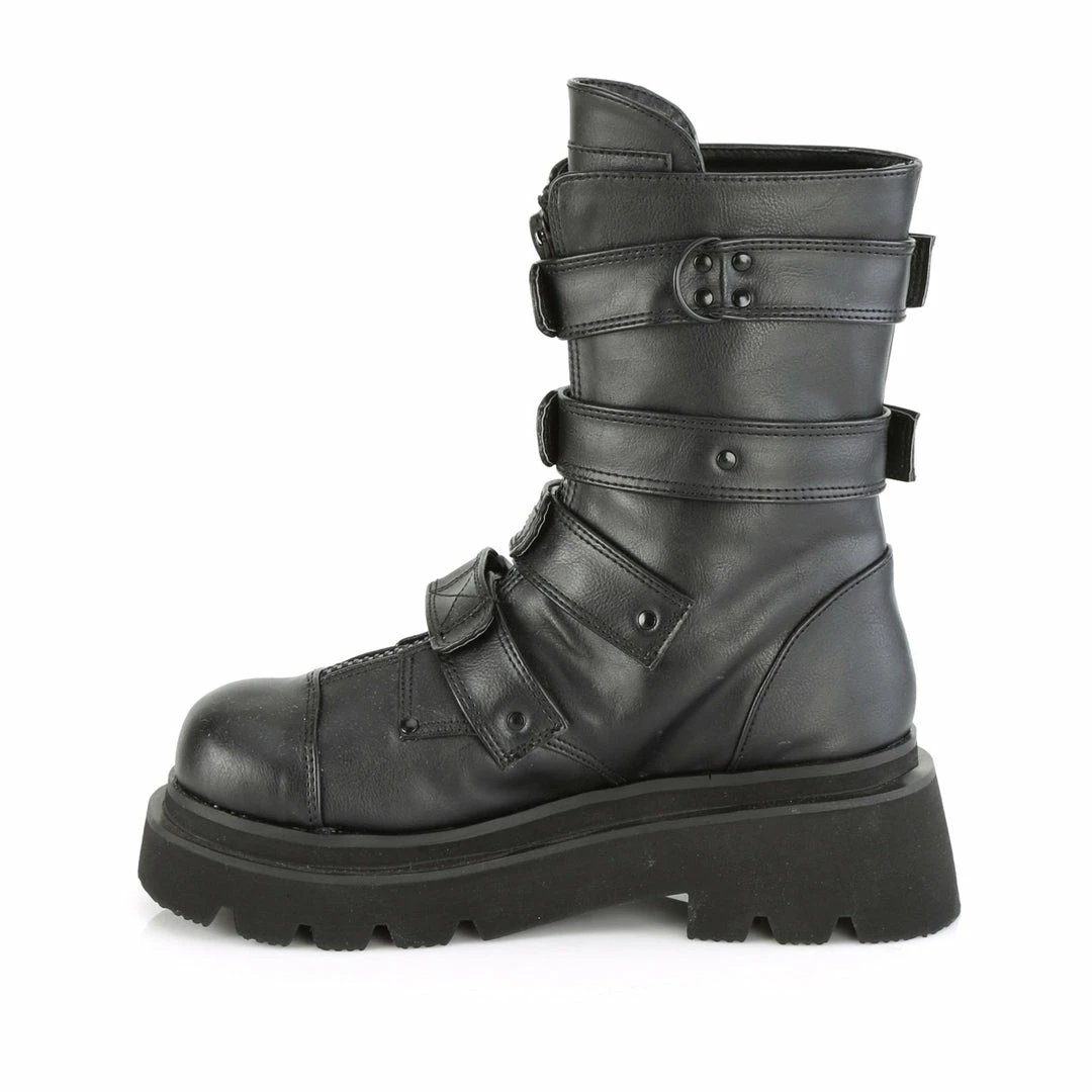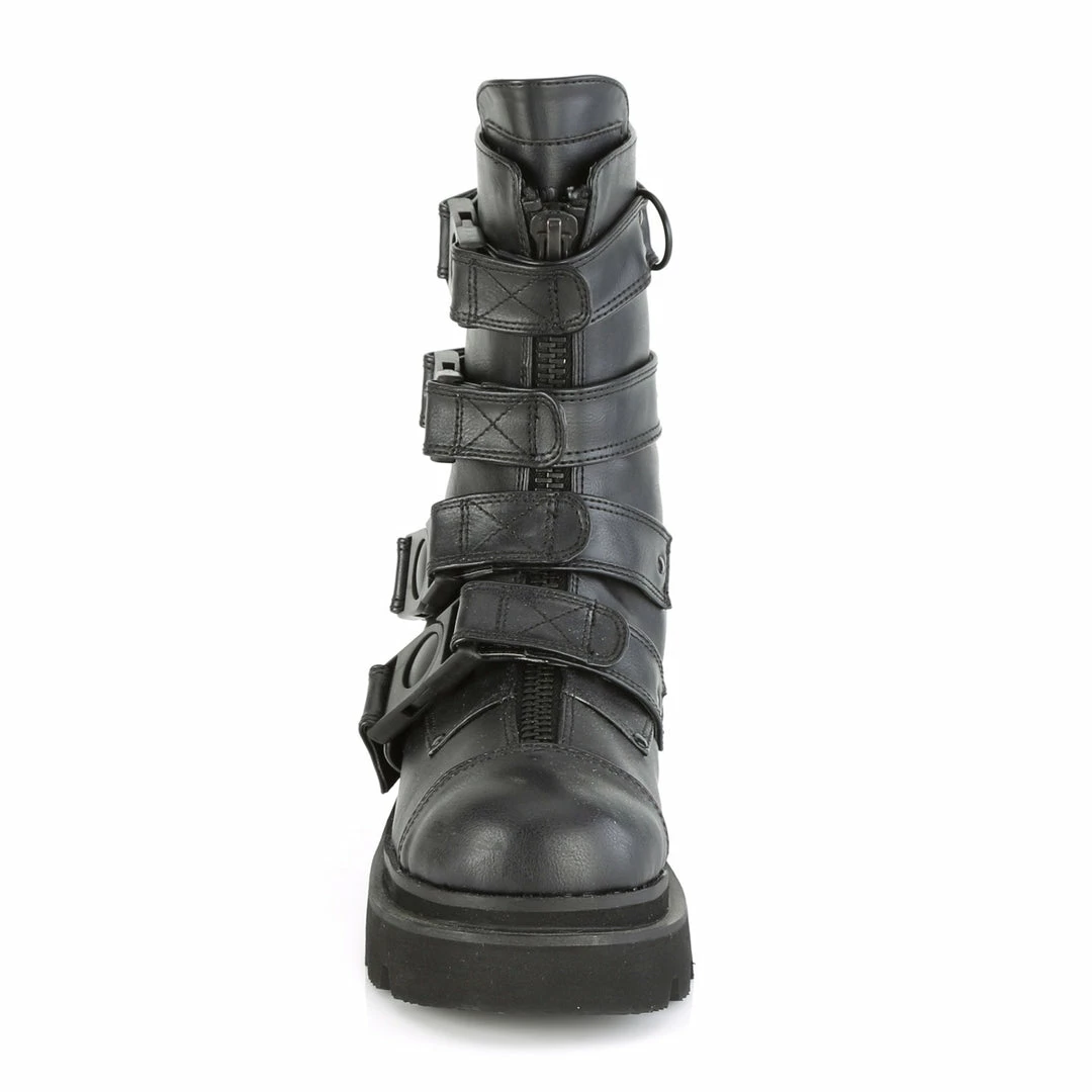 2 1/2″ Tiered Platform Strappy Calf High Boot Featuring Quick Release Plastic Buckle Straps, Center Front Metal Zip Closure