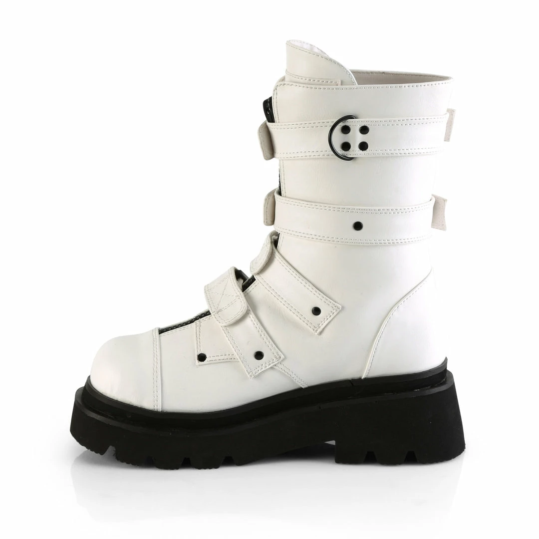 2 1/2″ Tiered Platform Strappy Calf High Boot Featuring Quick Release Plastic Buckle Straps, Center Front Metal Zip Closure