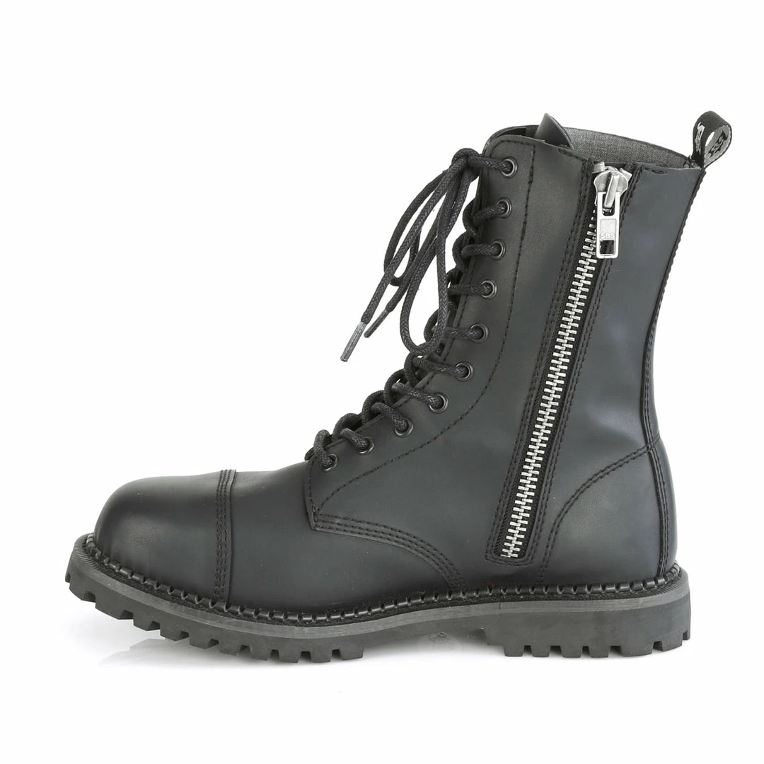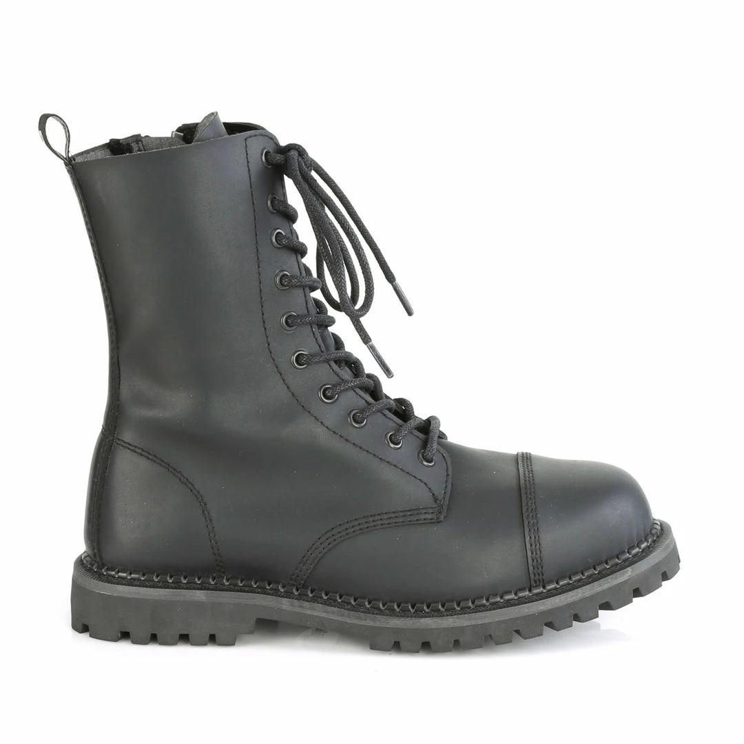Demonia 10 Eyelet Unisex Vegan Steel Toe Lace-Up Ankle Boot, Rubber Sole