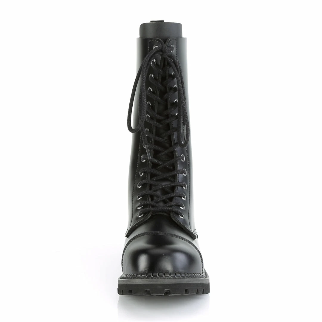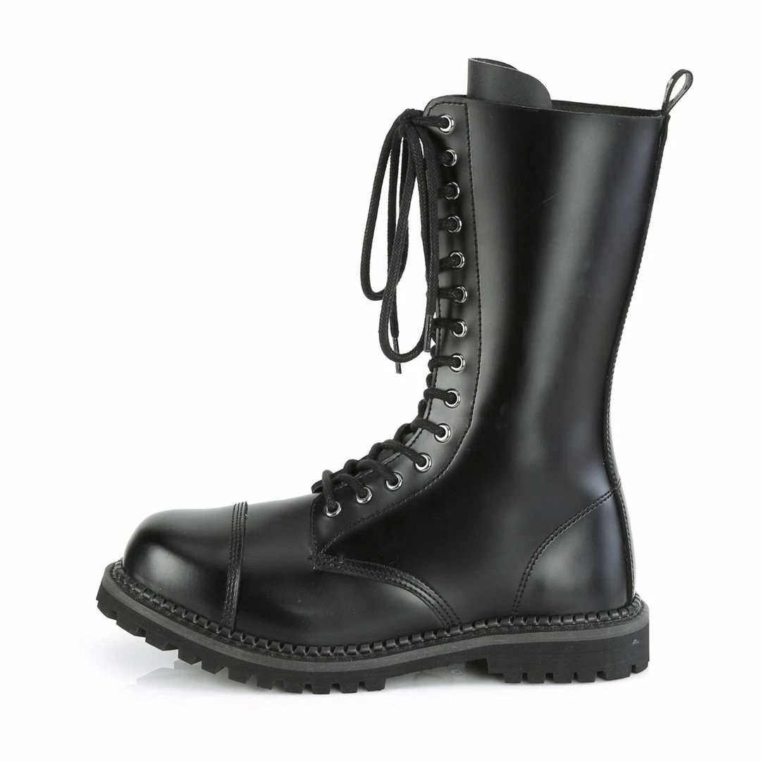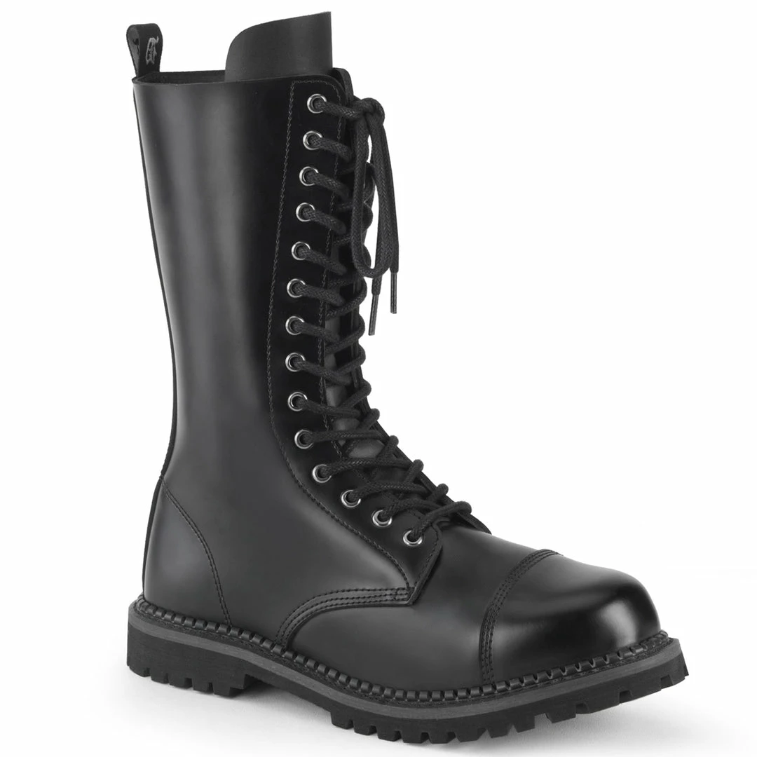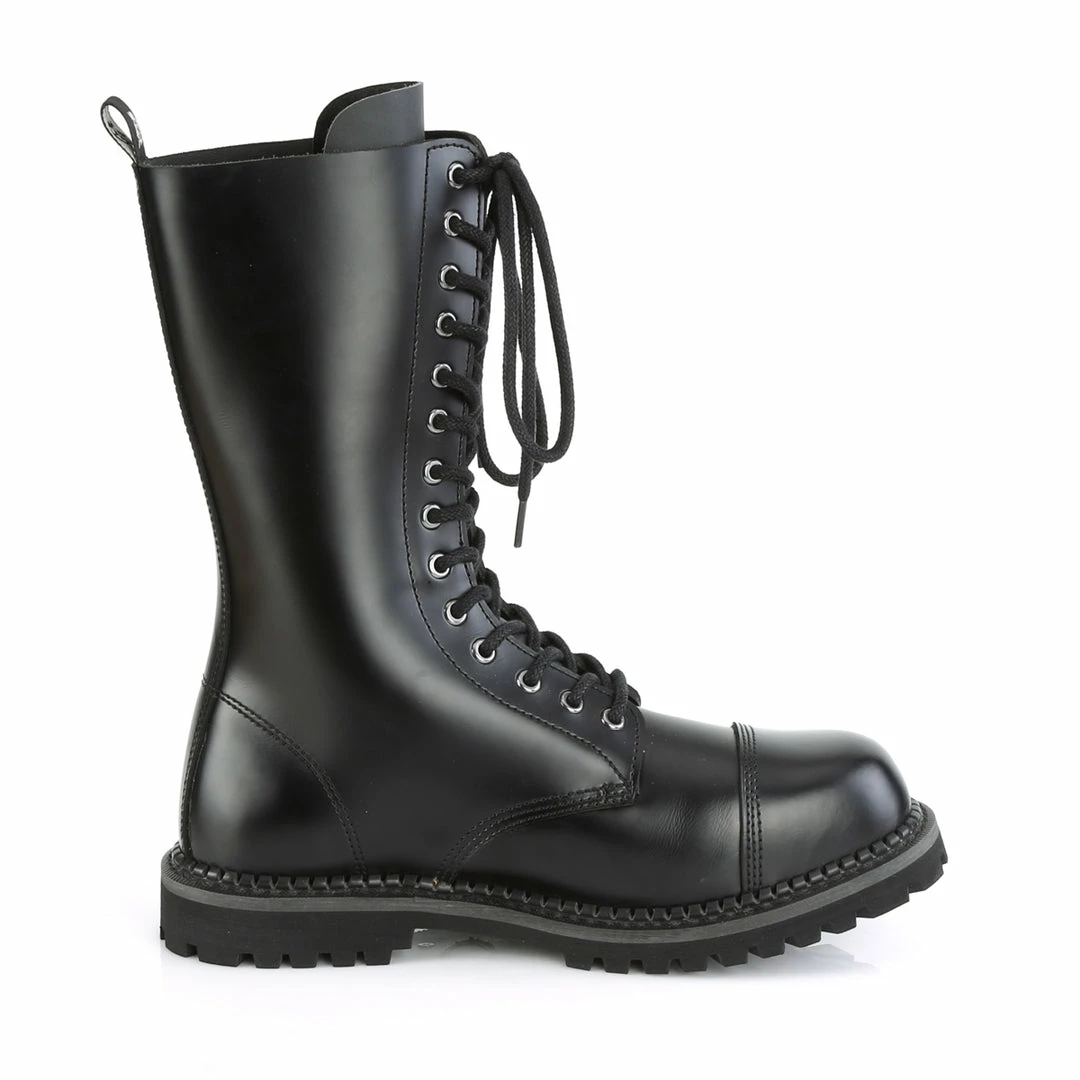 Demonia 14 Eyelet Unisex Genuine Leather Steel Toe Lace-Up Mid Calf Boot, Rubber Sole