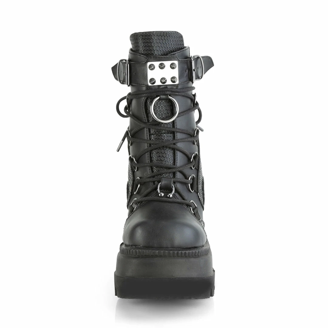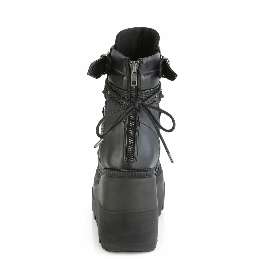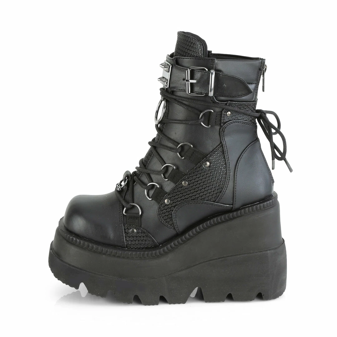 4 1/2″ (114mm) Wedge Platform Lace-Up Dual Buckle Ankle Boot Featuring Studded Contrast Panels & Pewter Tone Hardware On Front Center Vamp That Includes Horseshoe Ring , Spike Studded Metal Plate and Large O-Ring, Metal Back Zip Closure