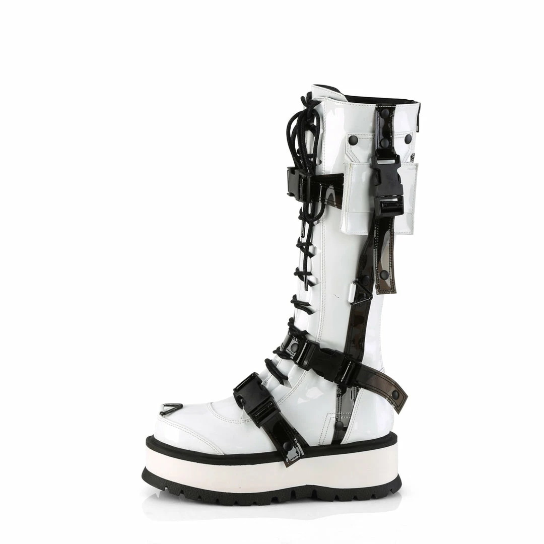 2″ (51mm) Platform Lace-Up Front Knee High Boot Featuring Cargo Side Pocket, Quick Release Plastic Buckle Straps and Studding & Triangle Ring Details, Full Back Metal Zip Closure