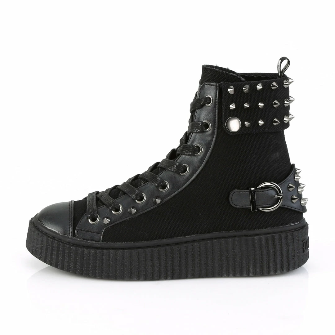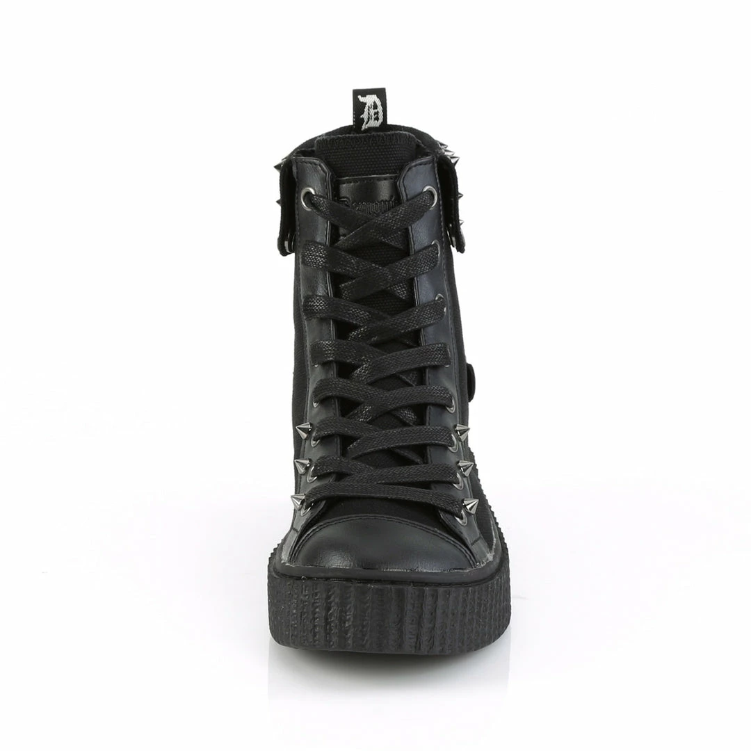 1 1/2″ (38mm) Platform Rubber Sole High Top Round Toe Lace-Up Front Creeper Sneaker Featuring Cuffed Snap Collar and Buckle Heel Strap w/ Stud Embellishments