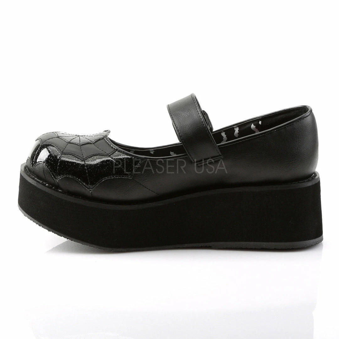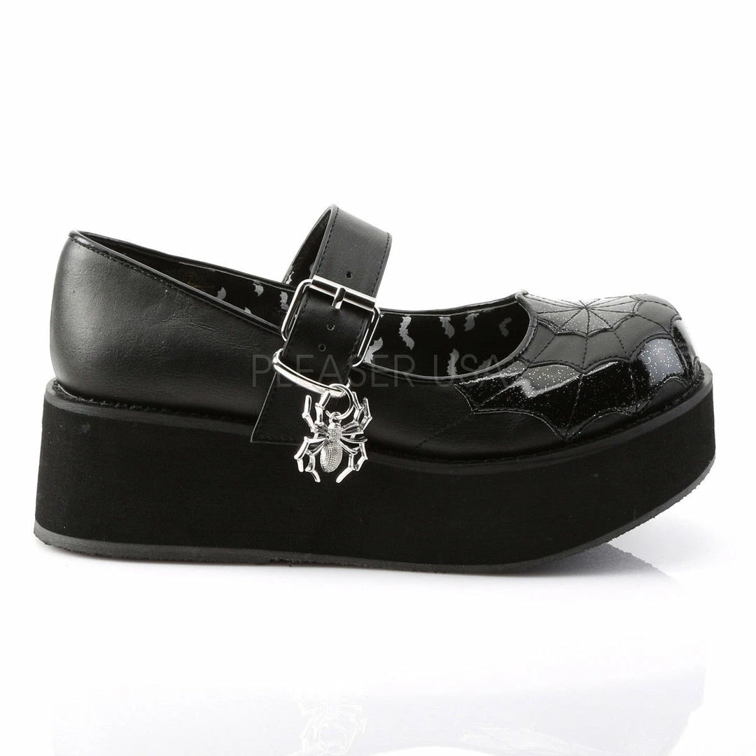 2 1/4″ (5.7cm) Platform Mary Jane Featuring Black Spider Web Pattern On Vamp & Spider Charm
