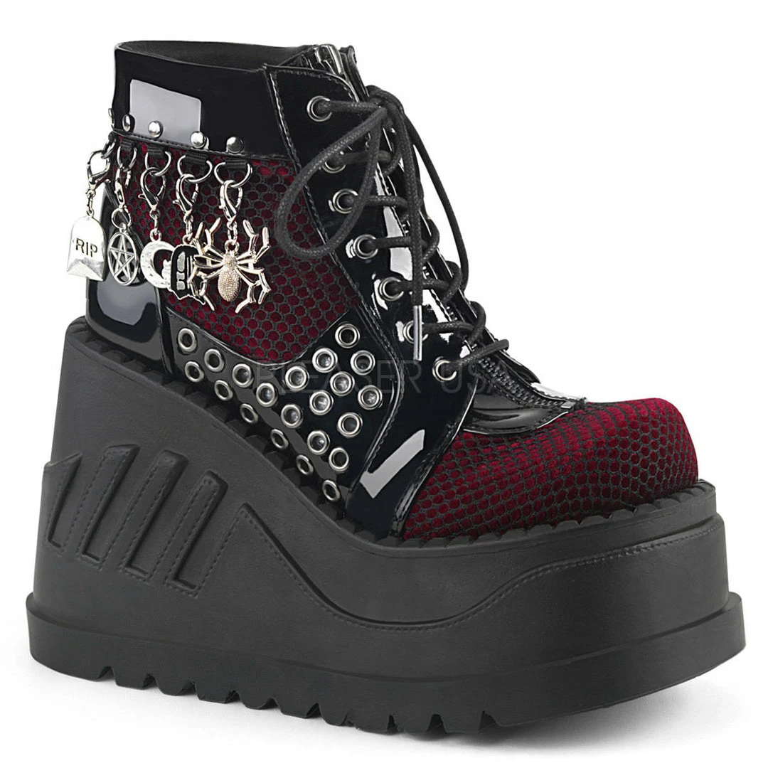 4 3/4″ (121mm) Platform Lace-Up Front Wedge Bootie Featuring Fishnet Overlay on Vamp, Eyelets on Outer Side Panel, Non-Functioning Zipper Detail on Tongue, and D-Rings w/ Various Dangling Charms, Inside Metal Zip Closure