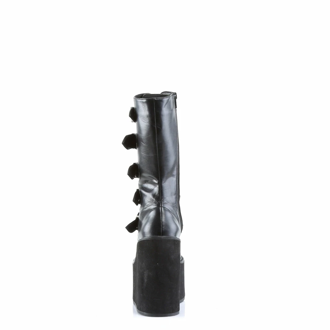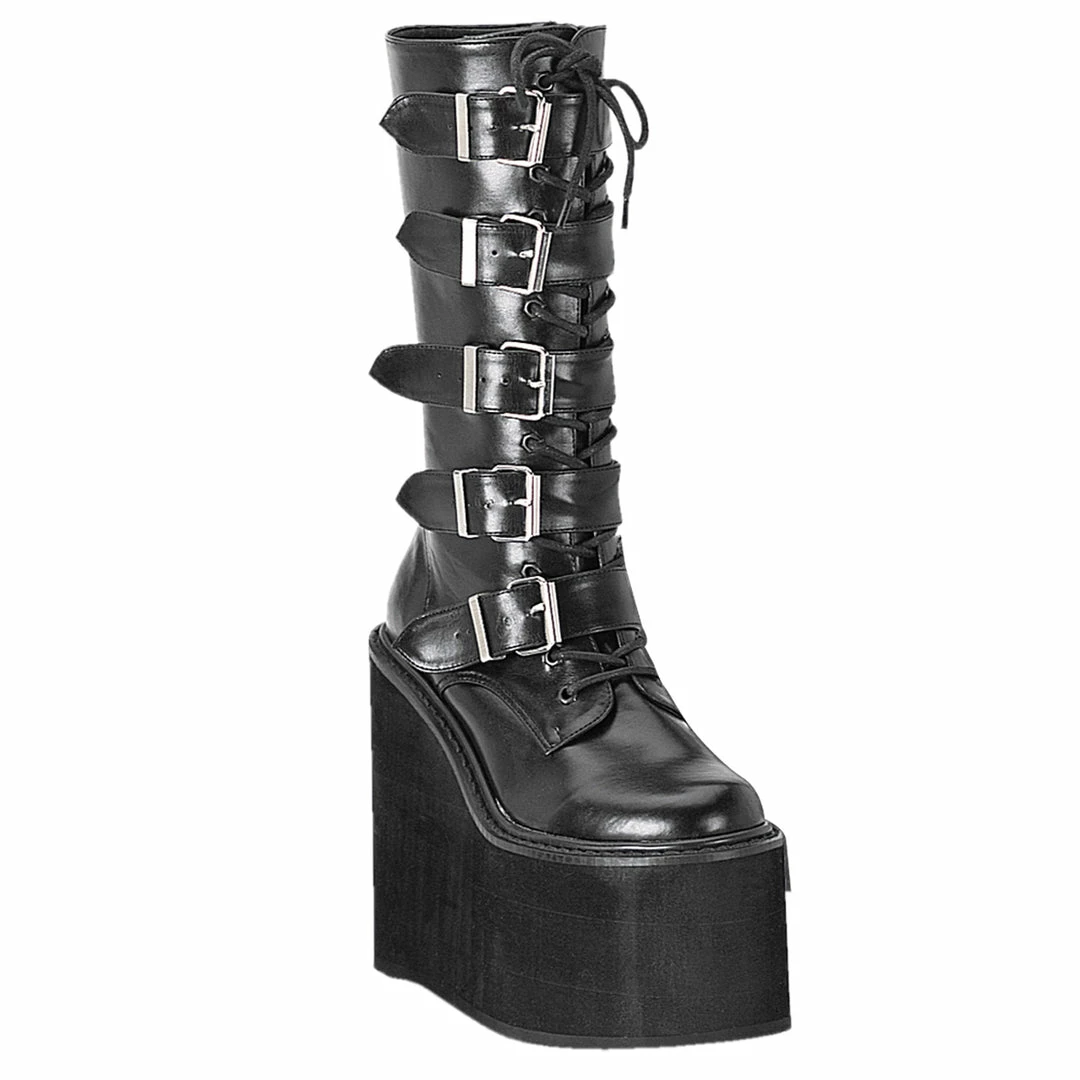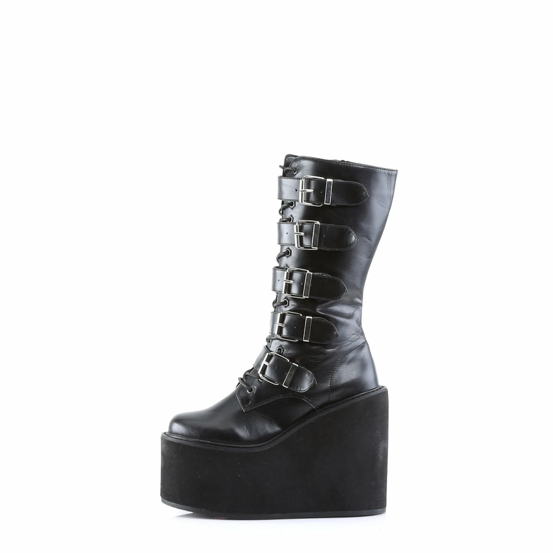 5 1/2″ (14cm) Wedge Platform Cyber Punk 5 Buckle Platform Calf Boot, Full Back Zipper Black Faux Leather