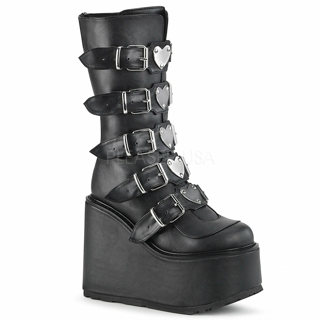 5 1/2″ (140mm) Platform Mid-Calf Boot Featuring 5 Buckle Straps w/ Heart Shaped Metal Plates at Center, Back Metal Zip Closure