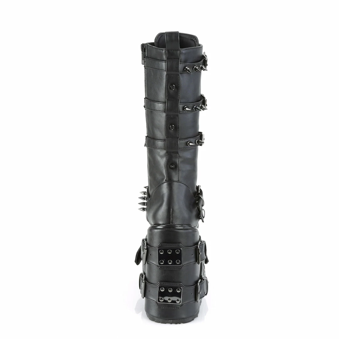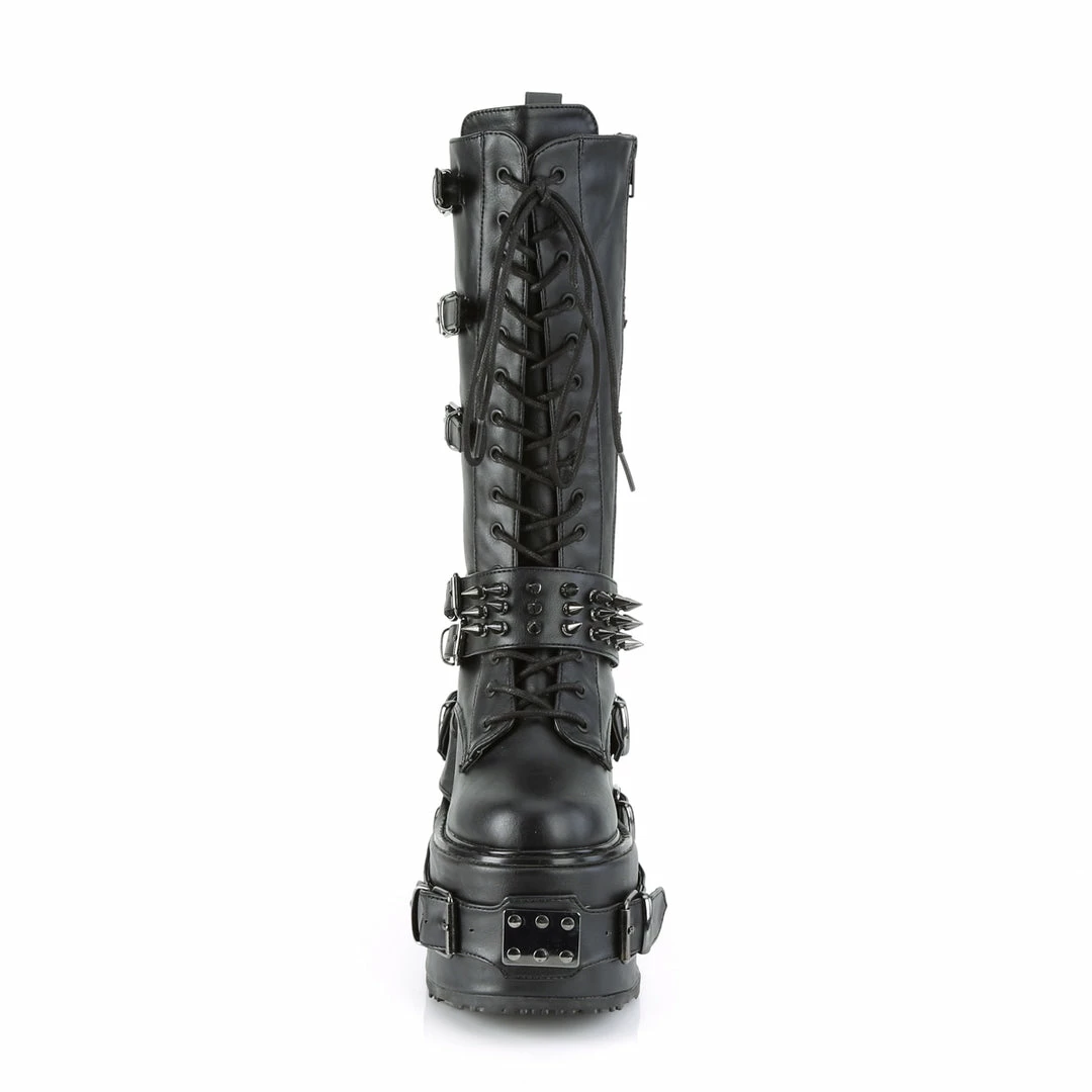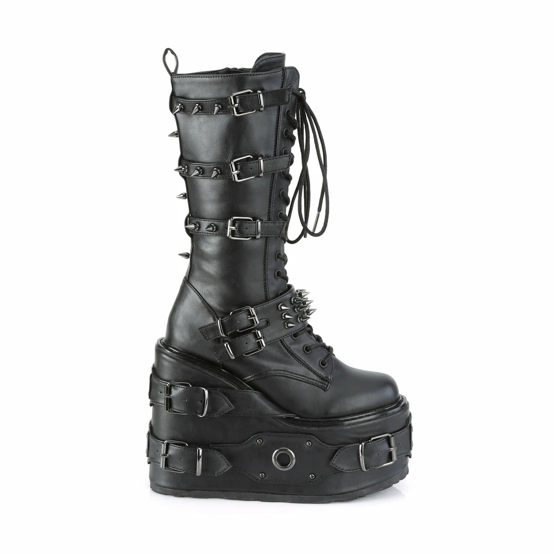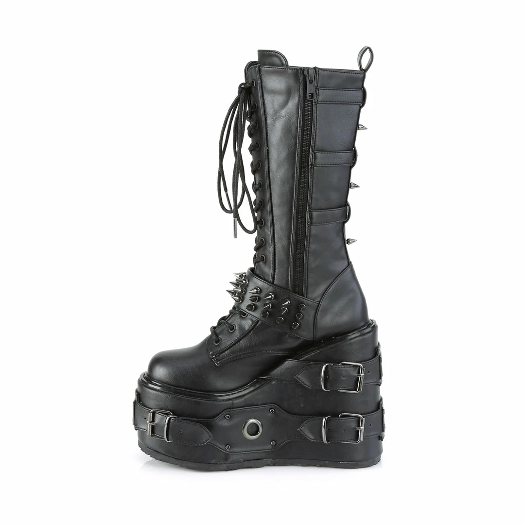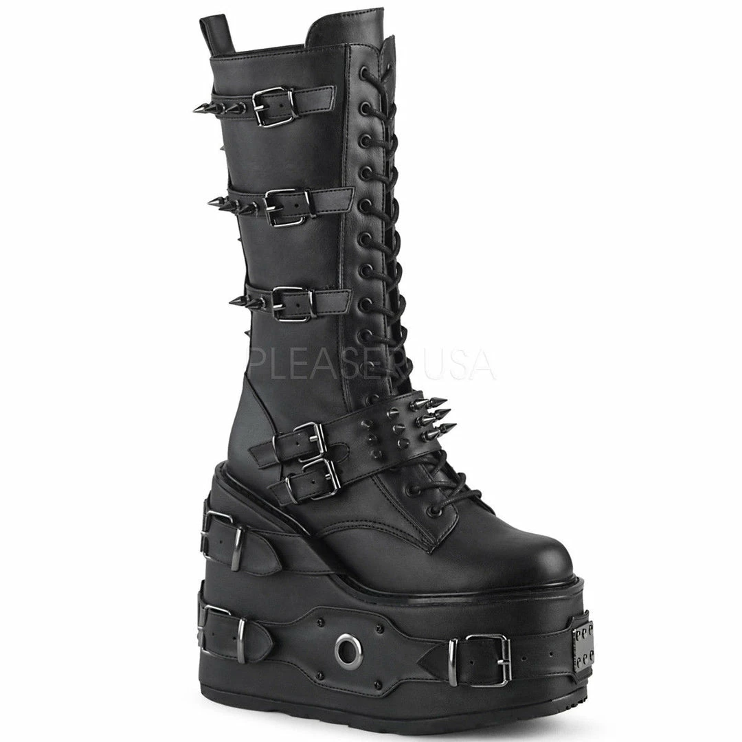 5 1/2″(140mm) Platform Wedge Lace-Up Front Knee High Boot Featuring Multi Metal Spike Adorned Buckle Straps & Buckle Straps w/ O-Ring & Metal Plate Detail on the Platform, Inside Zip Closure