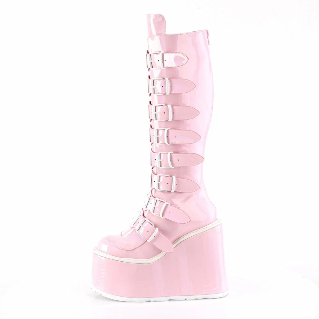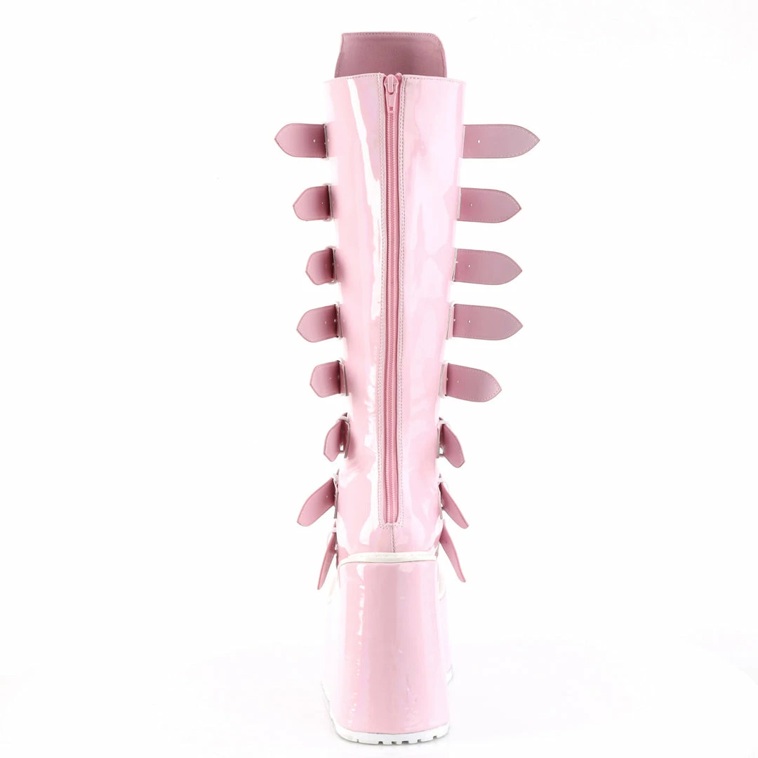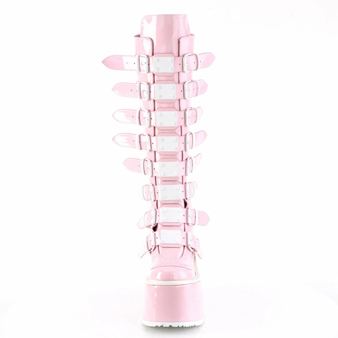 5 1/2″ (140mm) Platform Knee High Boot Featuring 8 Buckle Straps w/ Metal Plates at Center, Back Metal Zip Closure