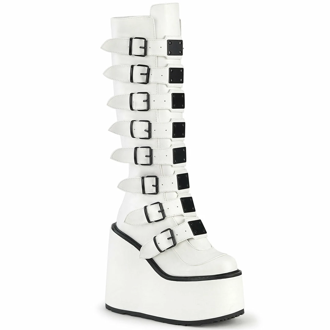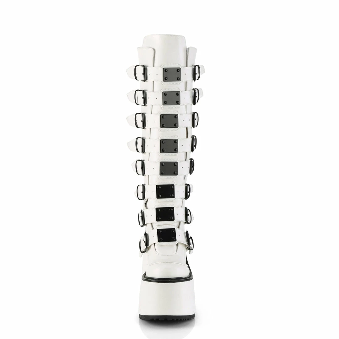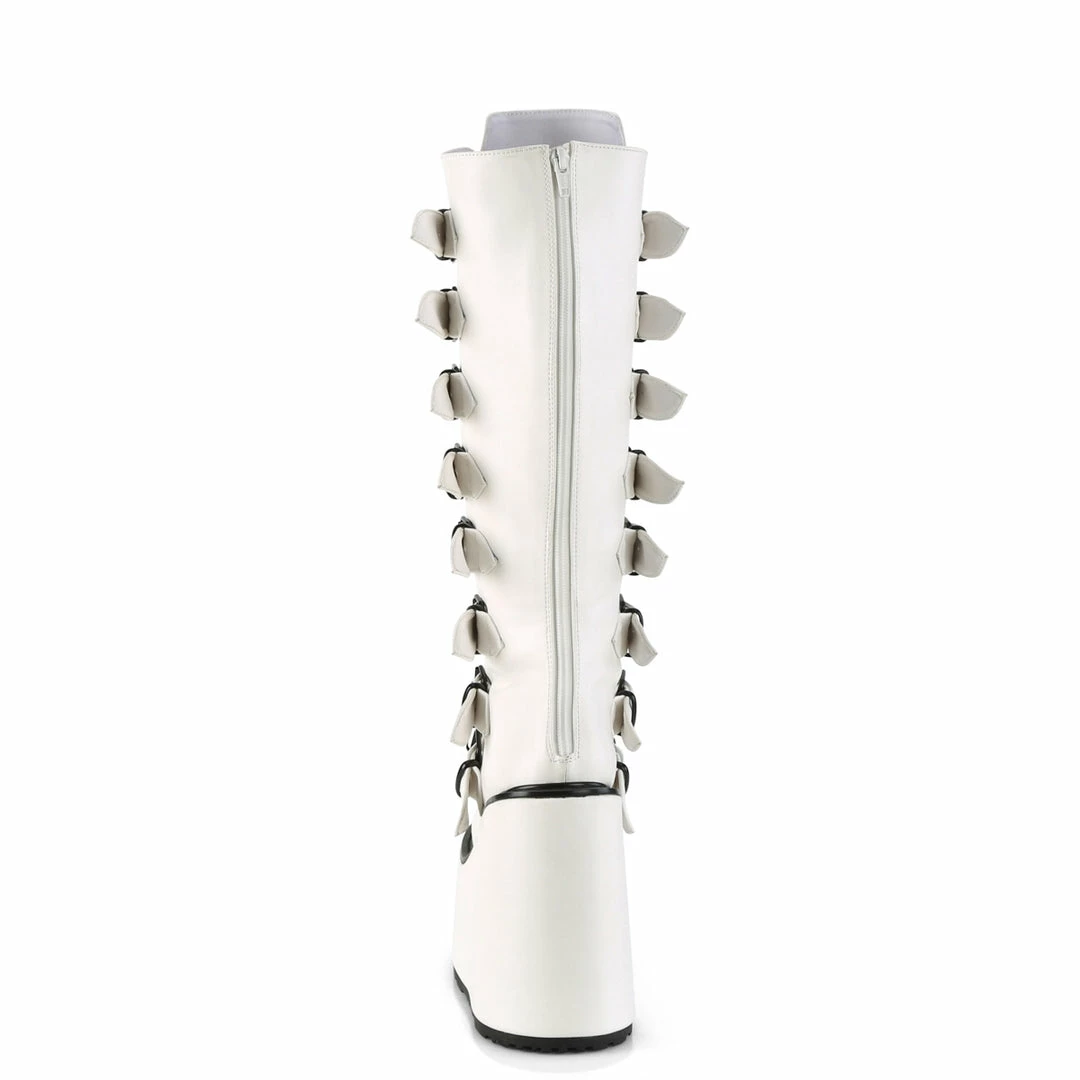 5 1/2″ (140mm) Platform Knee High Boot Featuring 8 Buckle Straps w/ Metal Plates at Center, Back Metal Zip Closure