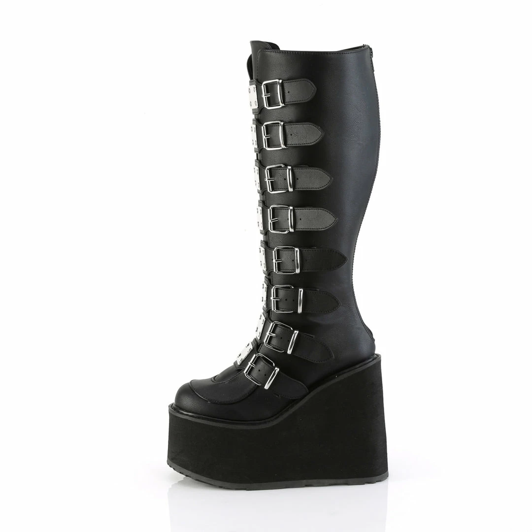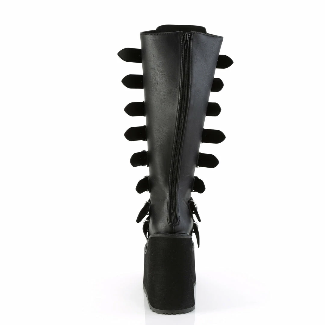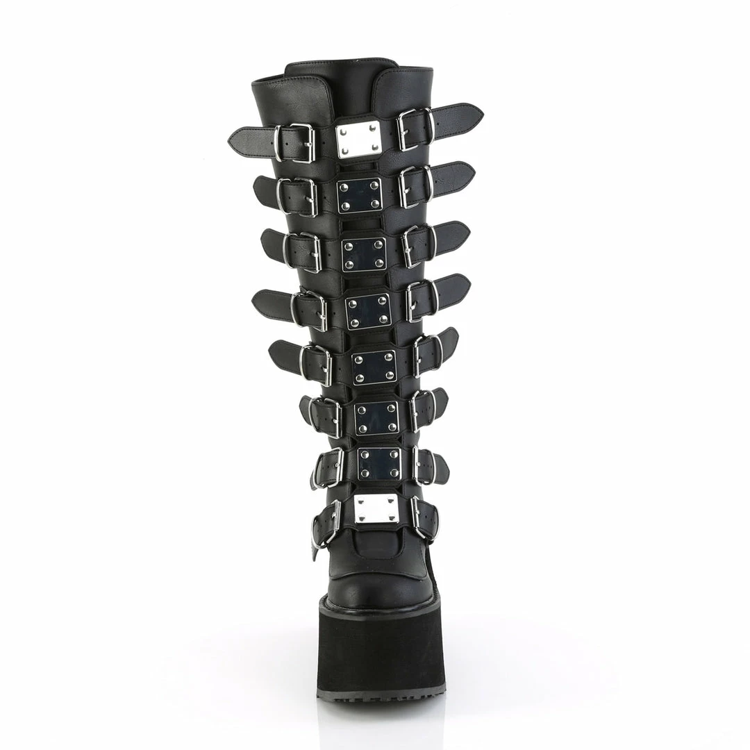 5 1/2″ (140mm) Platform Wide Calf Knee High Boot Featuring 8 Buckle Straps w/ Metal Plates at Center, Back Metal Zip Closure