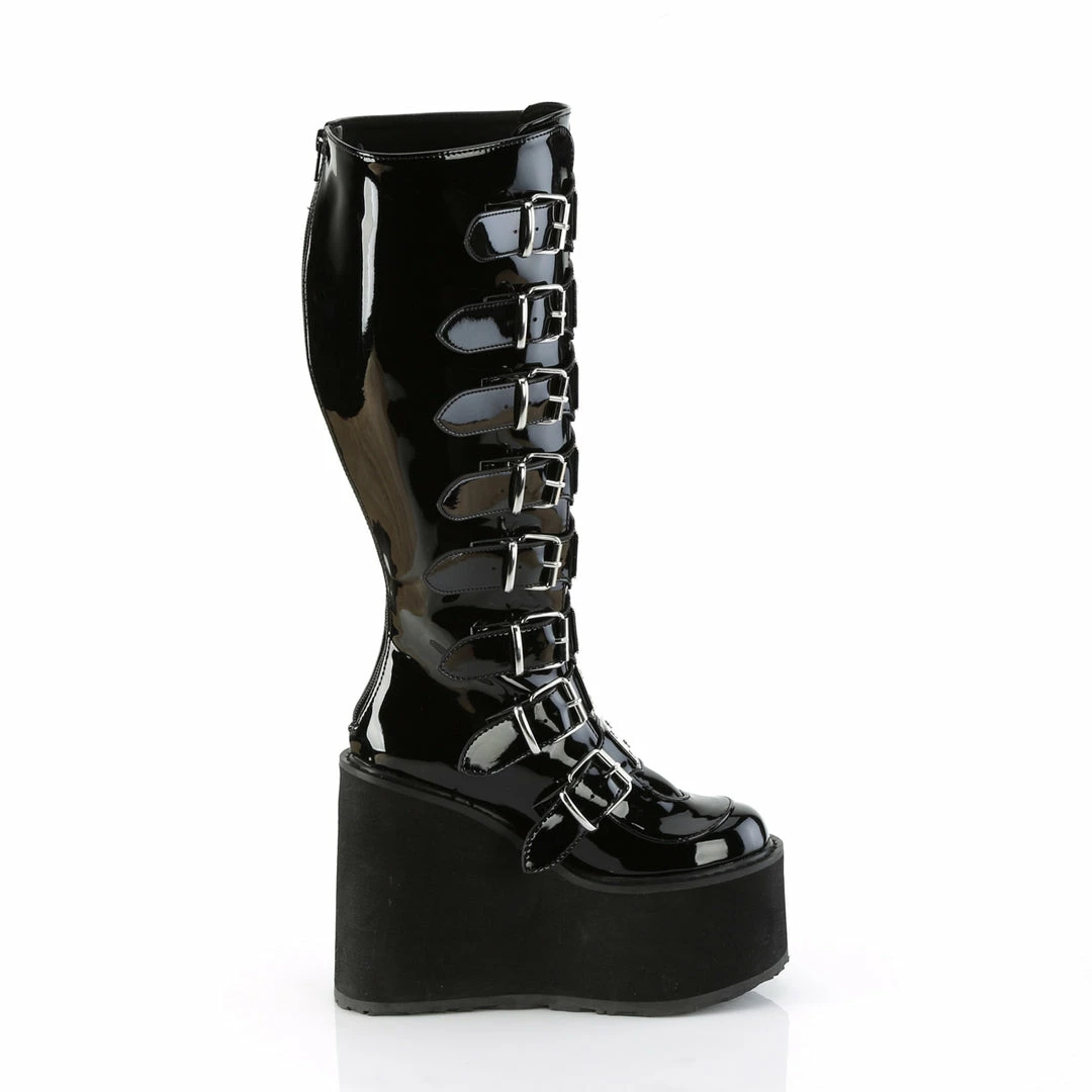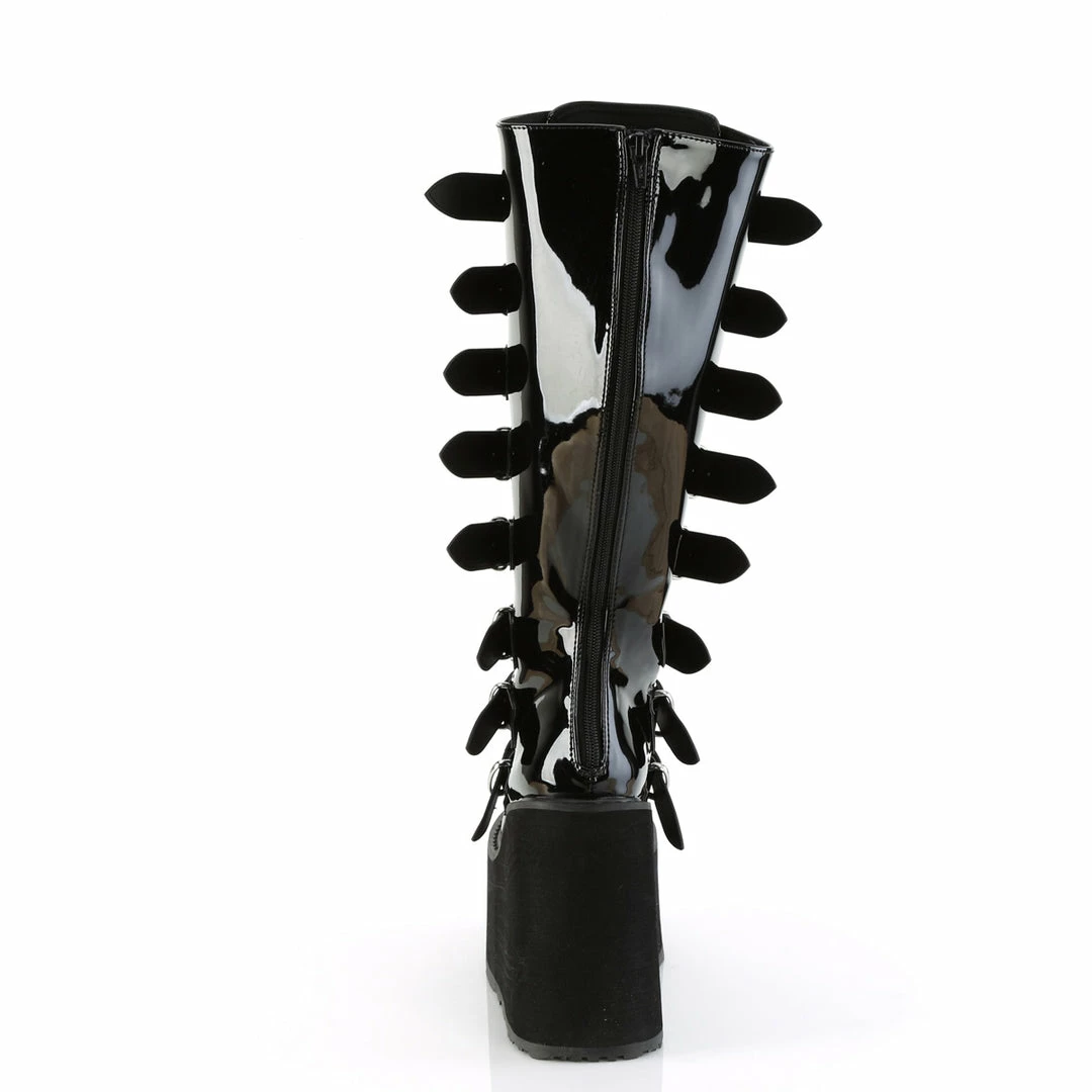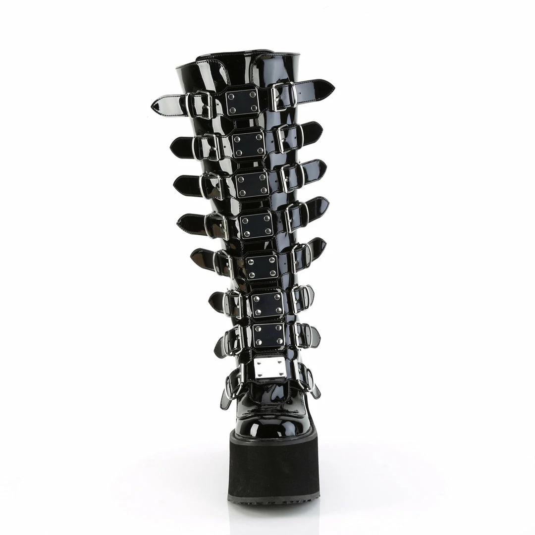 5 1/2″ (140mm) Platform Wide Calf Knee High Boot Featuring 8 Buckle Straps w/ Metal Plates at Center, Back Metal Zip Closure