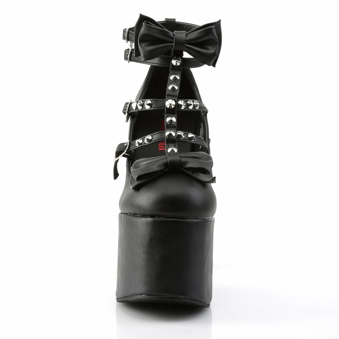 5 1/2″ (14cm) Block Heel, 3″ (7.6cm) Platform Strappy T-Strap Pump Featuring Double Bows and Spiky Studs Embellishment