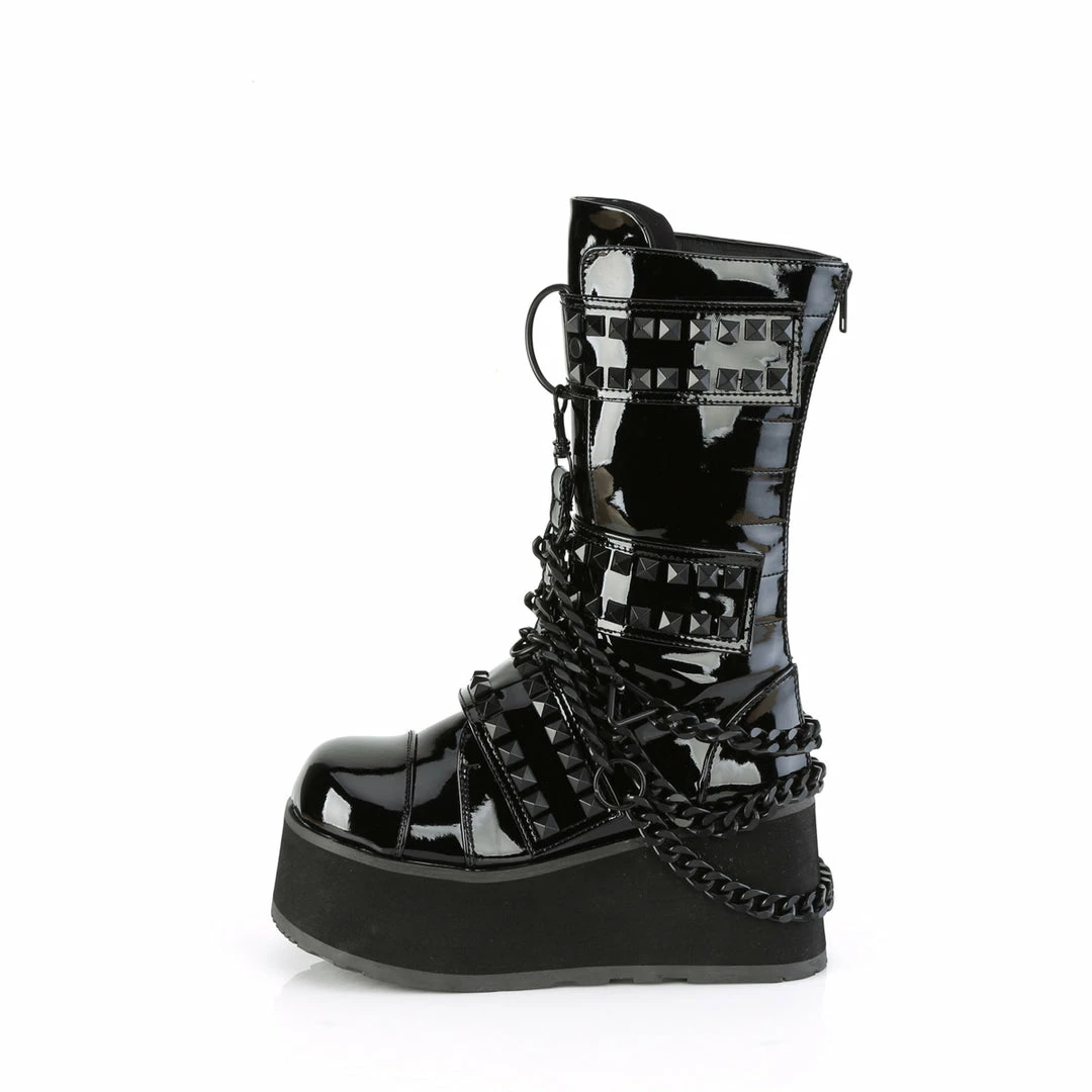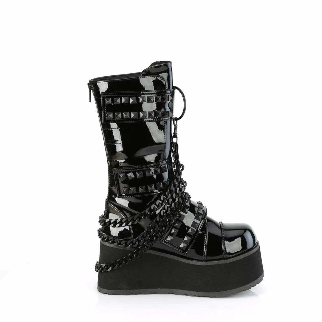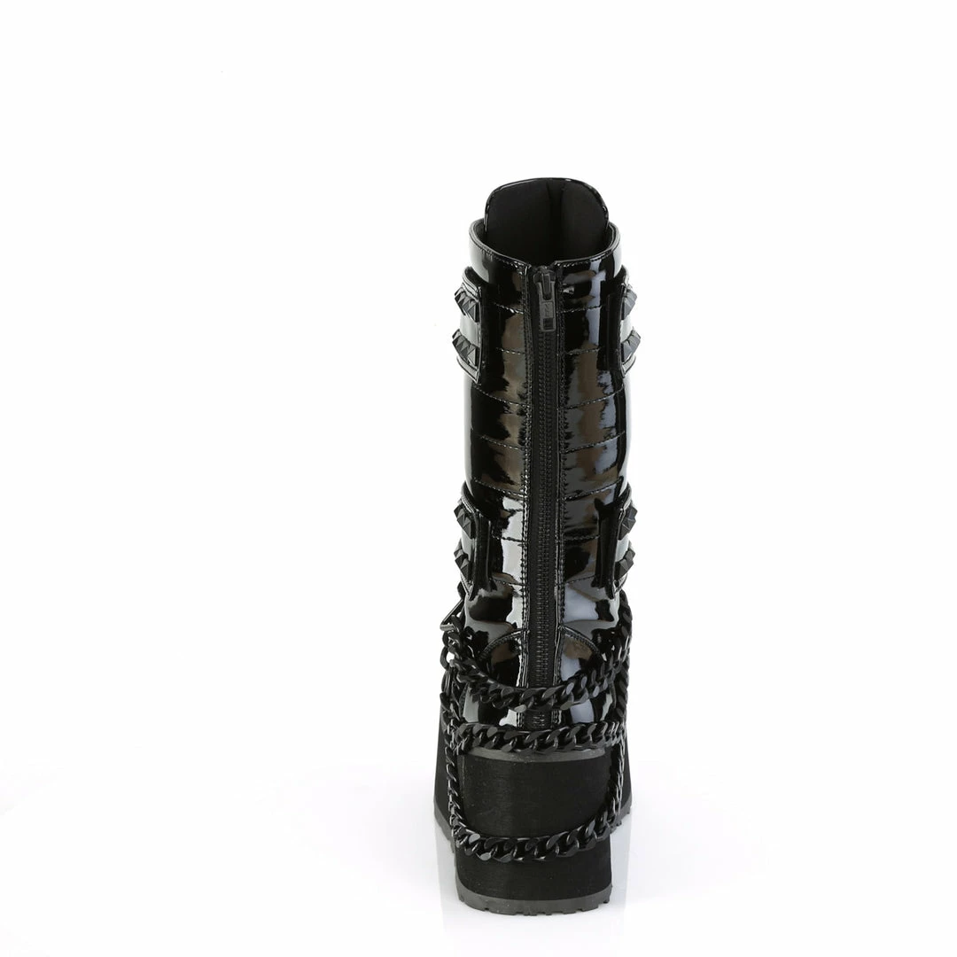 3 1/4″ (83mm) Platform Pyramid Studded Triple Hook and Loop Strap Mid-Calf Boot Featuring Oversize D-Ring on the Top Strap W/ Swivel Hook Cascading Chain Detail, Back Metal Zip Closure