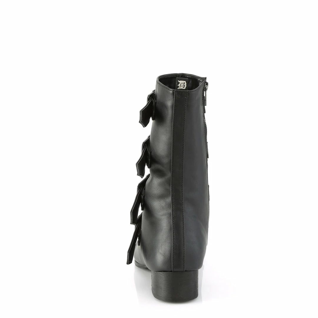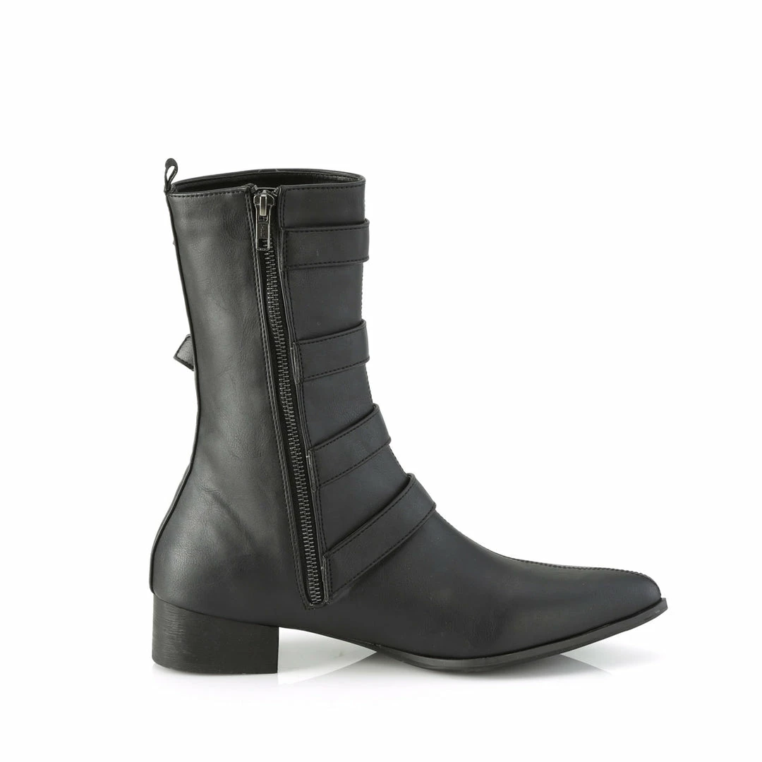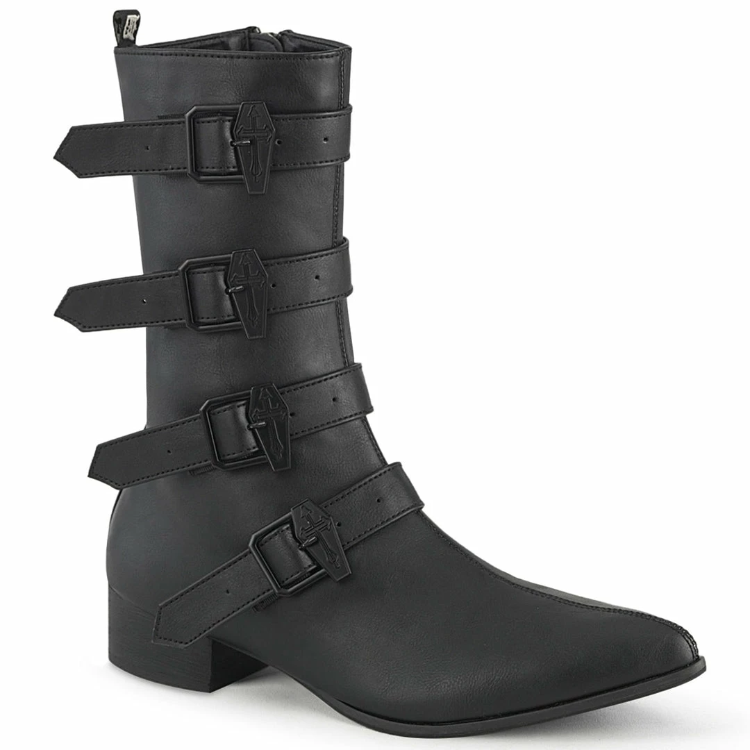 1 1/2″ (38mm) Block Heel Pointed Toe Winklepicker Style Mid-Calf Boot, Featuring Multi Coffin Buckle Straps, Inner Side Zip Closure