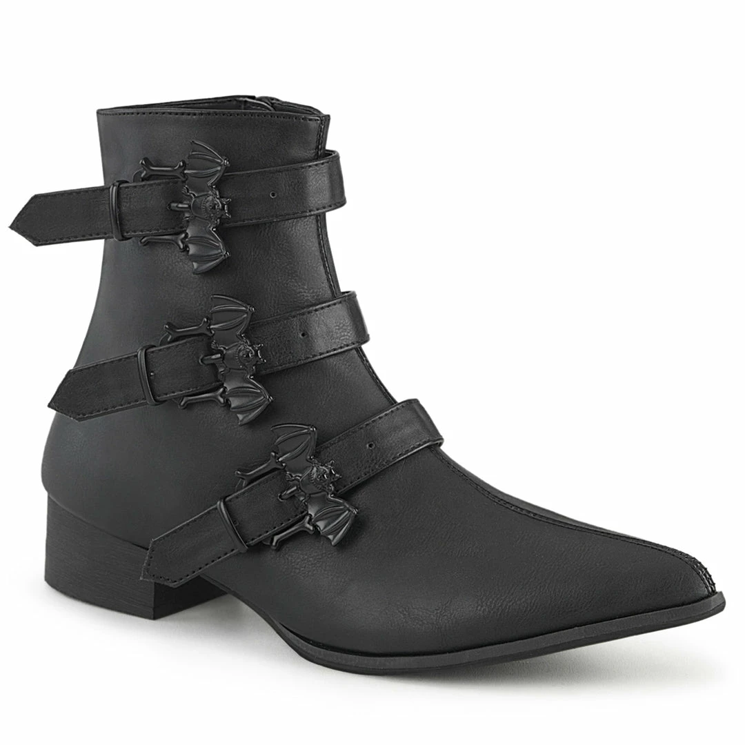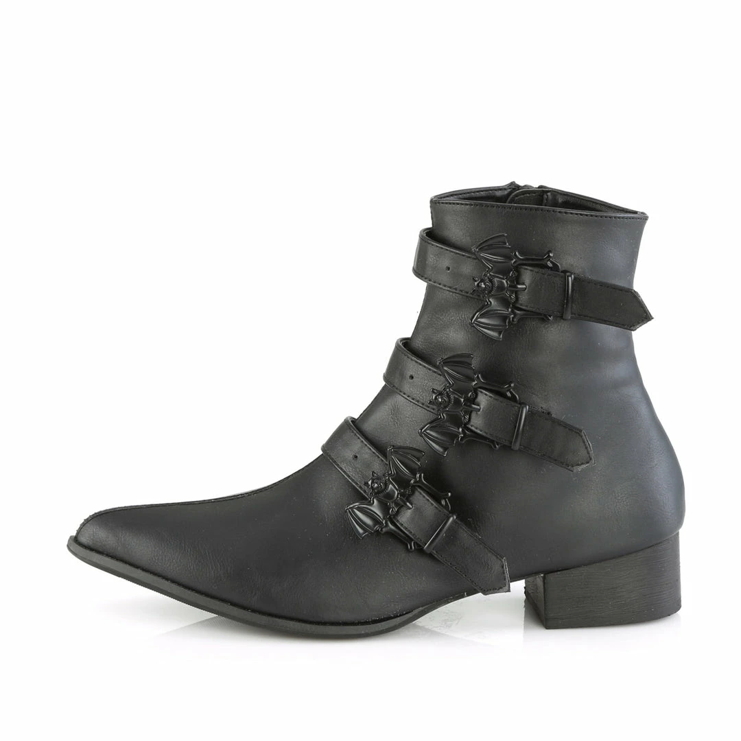 1 1/2″ (38mm) Block Heel Pointed Toe Winklepicker Style Ankle Boot, Featuring Triple Bat Buckle Straps, Inner Side Zip Closure