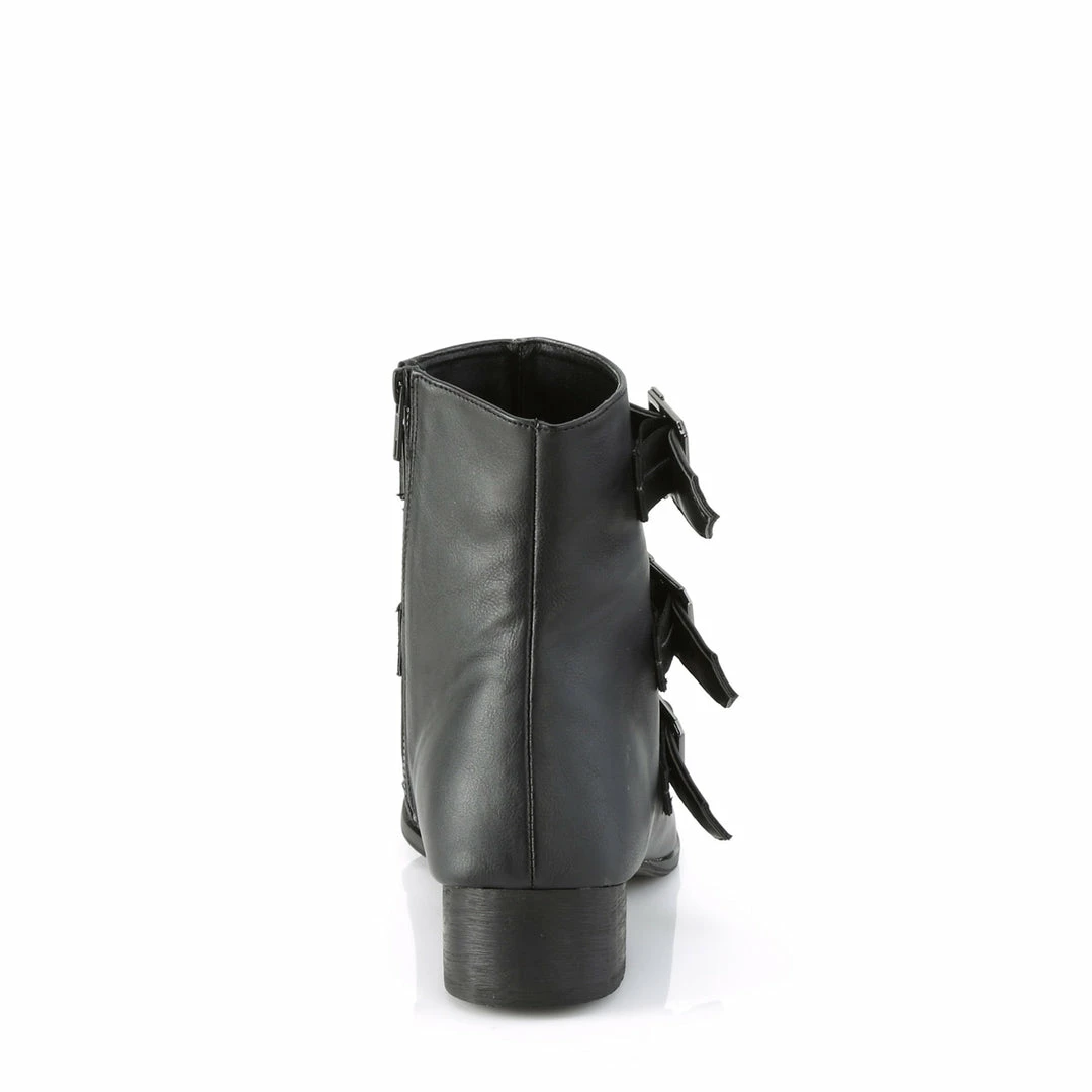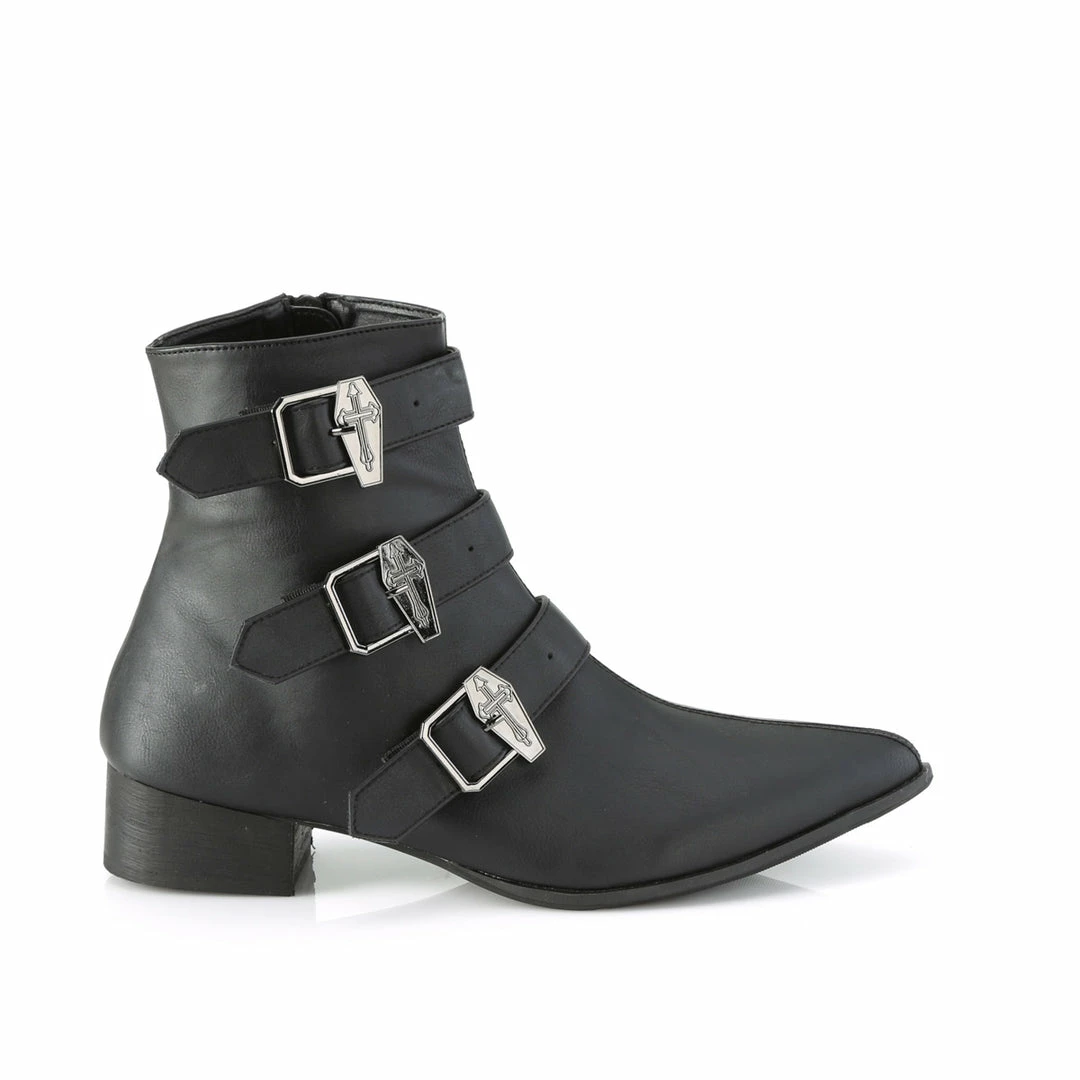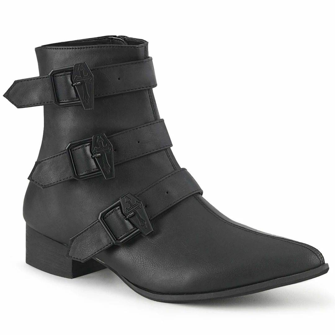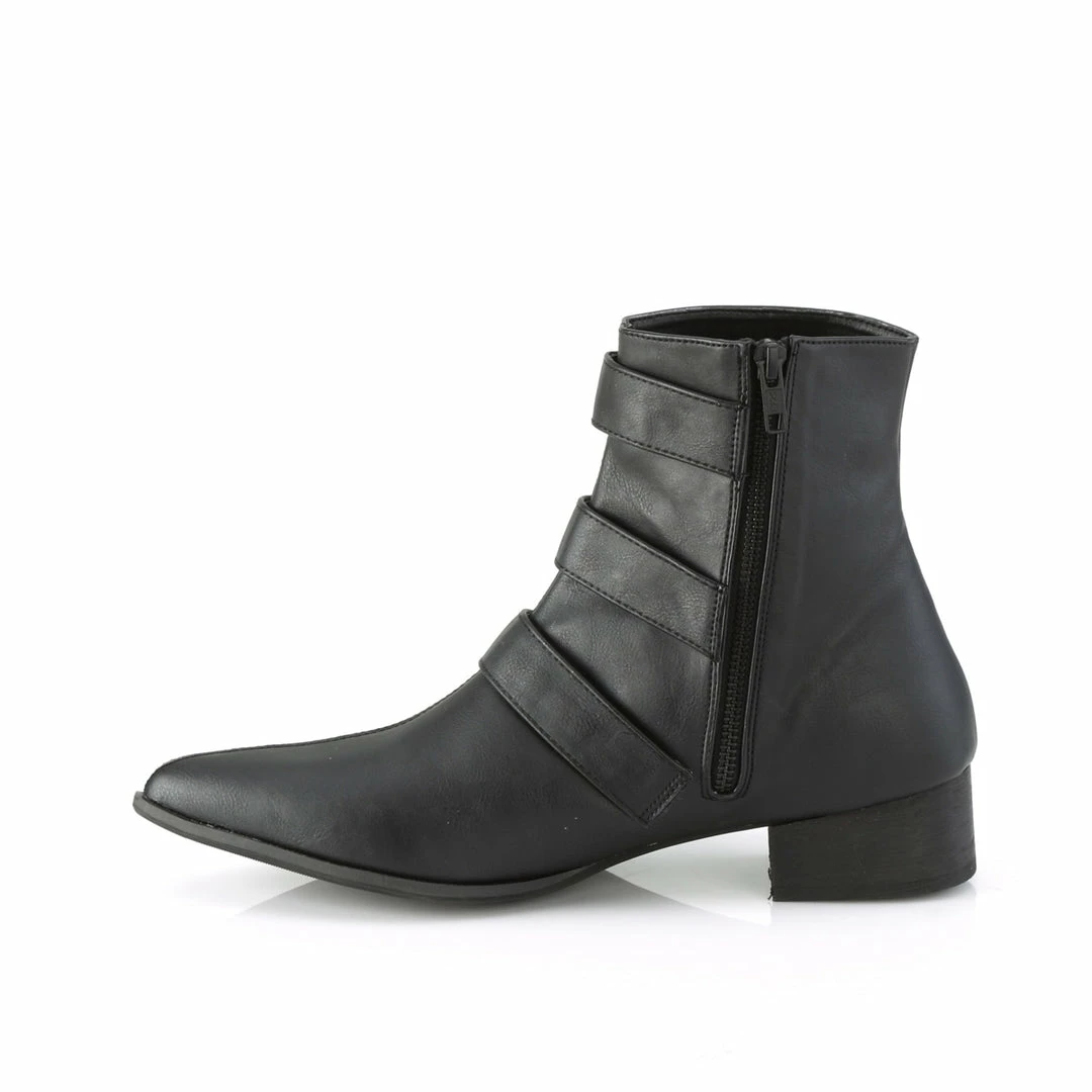 1 1/2″ (38mm) Block Heel Pointed Toe Winklepicker Style Ankle Boot, Featuring Triple Coffin Buckle Straps, Inner Side Zip Closure